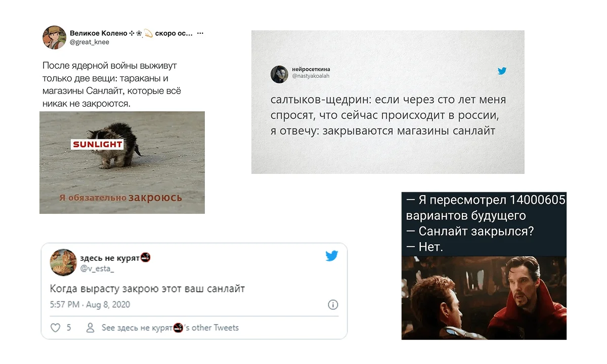 Бывает и так, что компании сообщают о закрытии точек продаж, об изъятии определенных товаров из оборота, но эти новости оказываются фейком. Например, с 2017 года ювелирная сеть Sunlight регулярно сообщает своим клиентам о закрытии магазинов. Бесконечная ликвидация поначалу приносила компании неплохой доход, но позже сделала Sunlight героем мемов. Хотя и они не мешают компании зарабатывать. Так, по данным Retail.ru, в 2023 году выручка компании составила 65 млрд рублей без учёта НДС, что на 54% больше, чем в 2022 году.