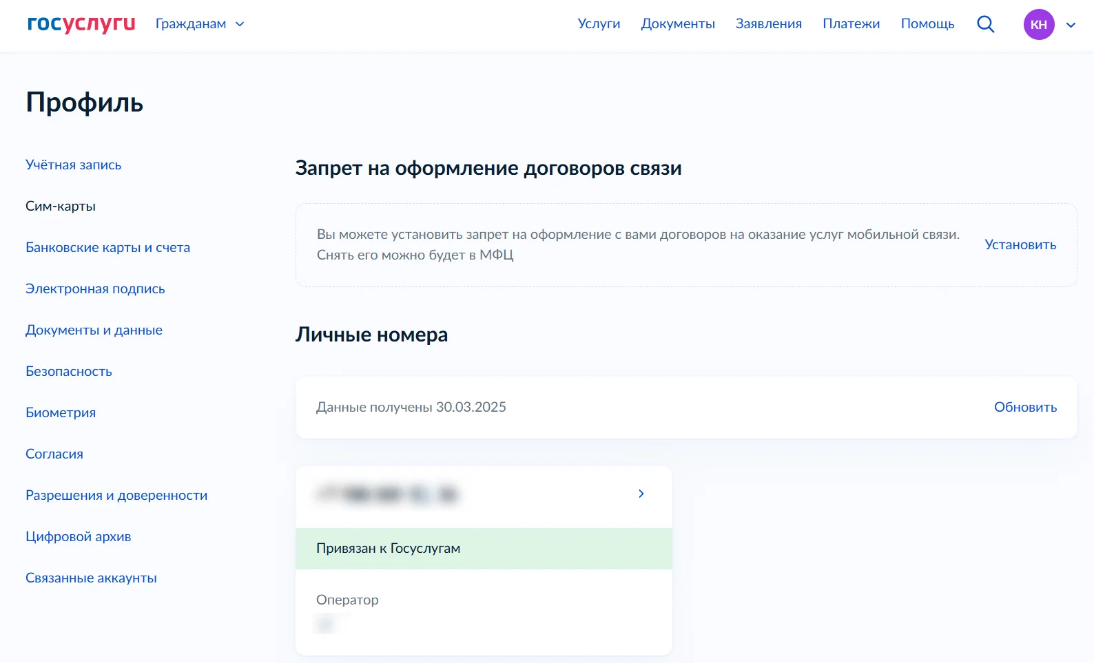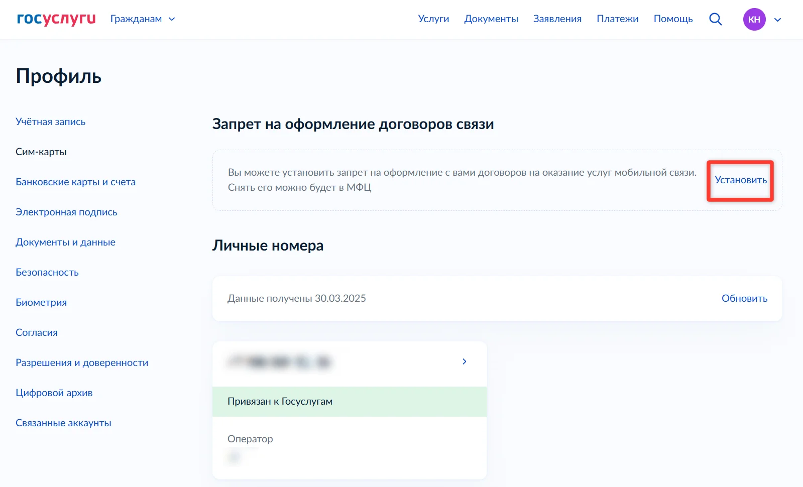 Чтобы оформить самозапрет на сим-карты, в профиле на «Госуслугах» перейдите в раздел «Сим-карты», выберите «Запрет на оформление договоров связи» и нажмите «Установить».