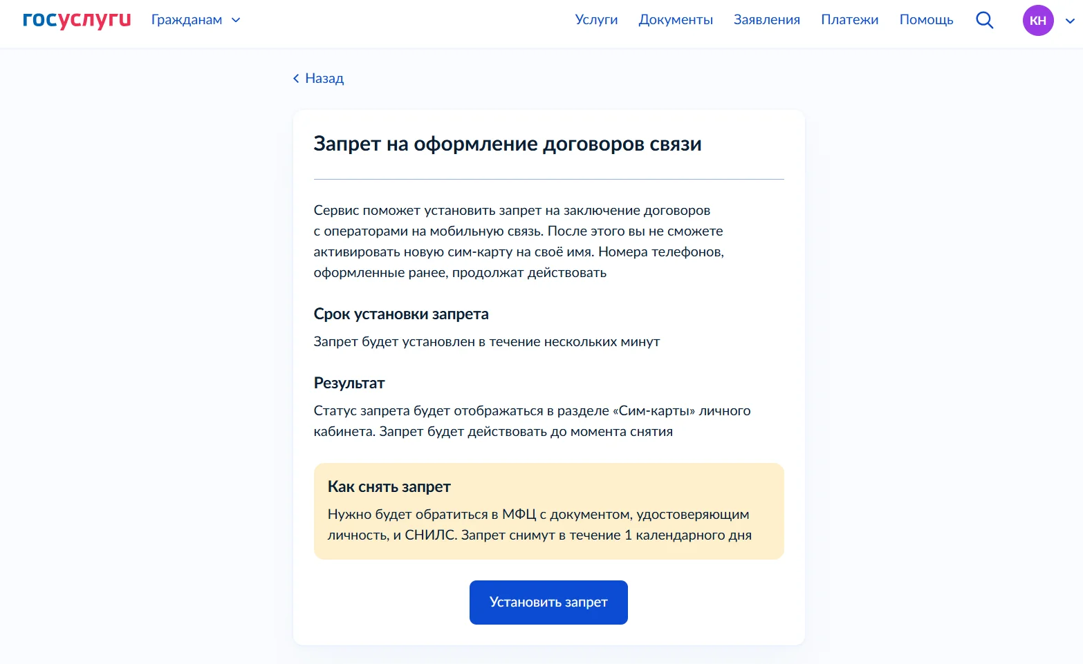 На следующем экране выбираем «Установить запрет», а далее ― «Отправить». Запрет начнет действовать в течение нескольких минут.