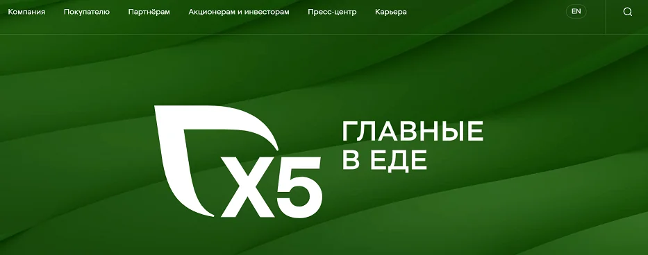 X5 Group — ведущая российская продовольственная компания, которой принадлежат сети «Пятерочка», «Перекресток», «Чижик». Зеленый цвет в качестве фона в айдентике формирует положительный образ доступных и качественных продуктов. Цвет выигрышно смотрится на сайте и на цифровых носителях.