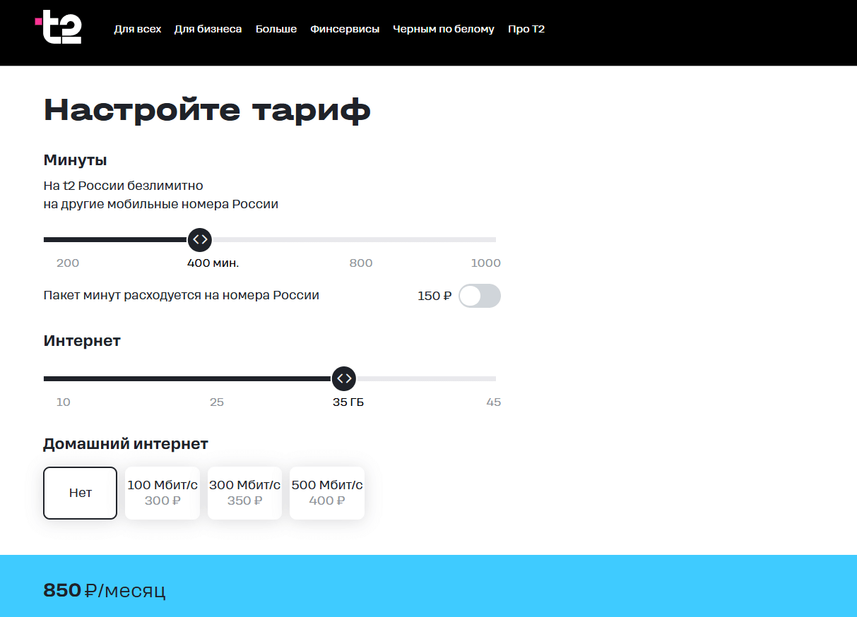 Нужно не просто предложить клиенту готовый тариф сотовой связи, а дать возможность настроить его под свои нужды. У оператора t2 десятки тарифов под любые потребности. А для тех, кто не нашел подходящий вариант, есть возможность собрать тариф «под себя»