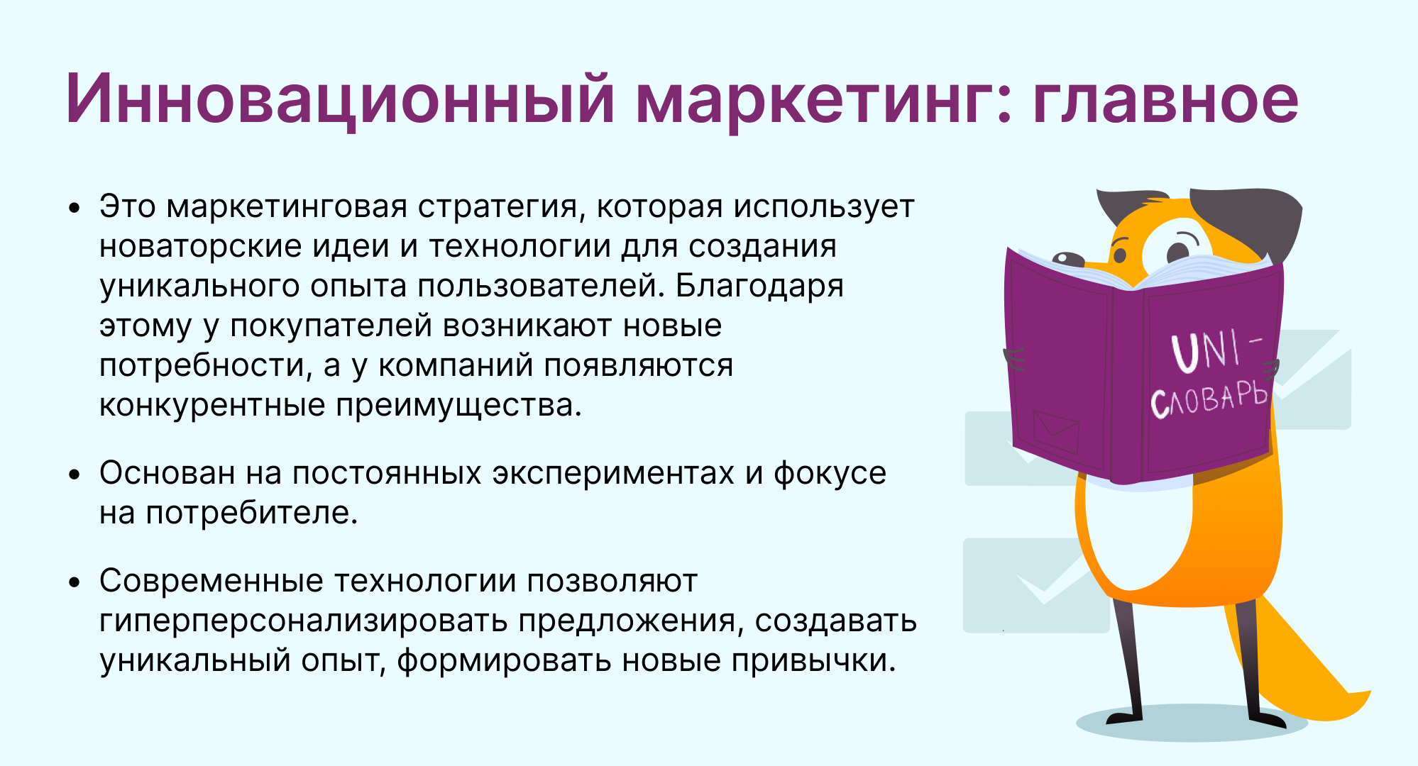 Инновационный маркетинг — это маркетинговая стратегия, которая использует новаторские идеи и технологии для создания уникального опыта пользователей. Благодаря этому у покупателей возникают новые потребности, а у компаний появляются конкурентные преимущества.