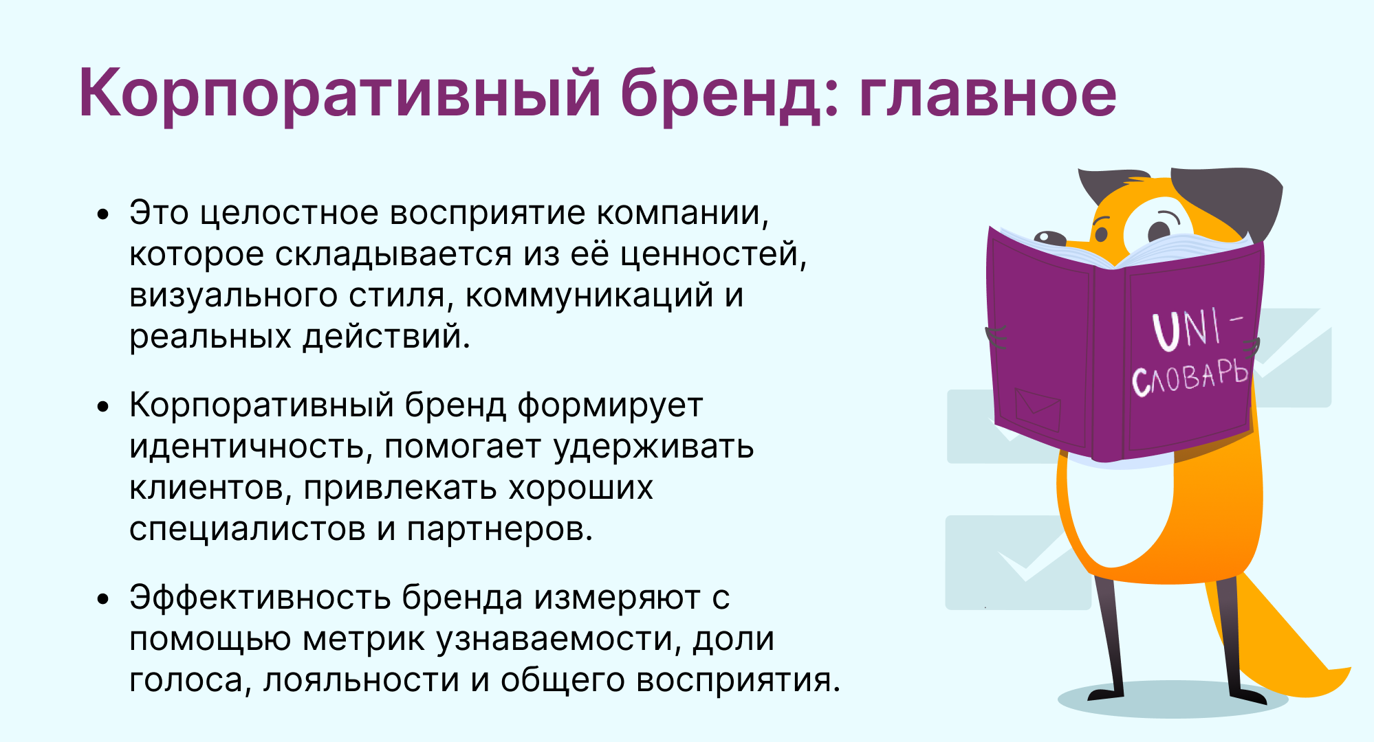 В отличие от продуктового бренда, который связан с конкретным товаром, корпоративный представляет компанию целиком. Он включает в себя визуальные элементы и нематериальные активы: философию бренда, корпоративную культуру, стиль общения с аудиторией. Всё это формирует целостное восприятие и влияет на решения людей: покупать ли продукт, работать ли в компании и инвестировать ли в неё.