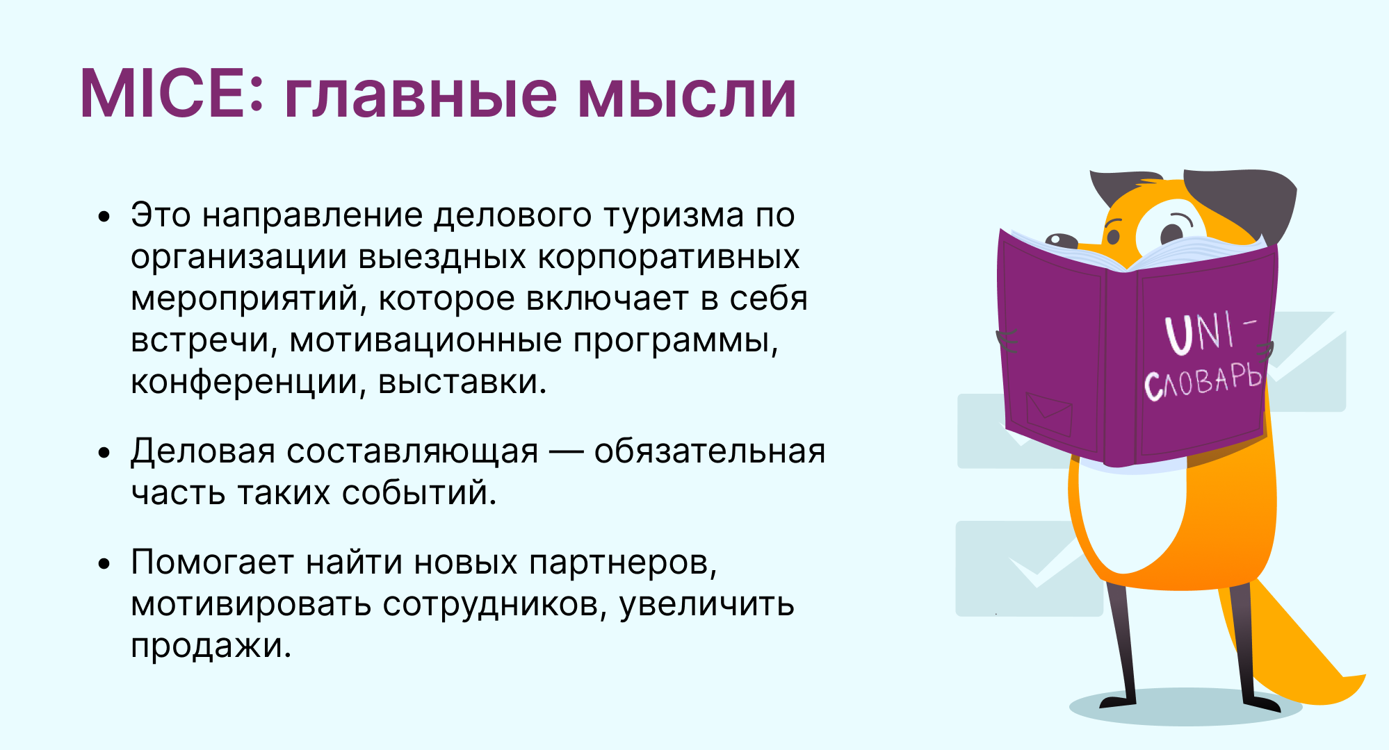 MICE (Meetings, Incentives, Conferences, Exhibitions) — это направление делового туризма по организации выездных корпоративных мероприятий.