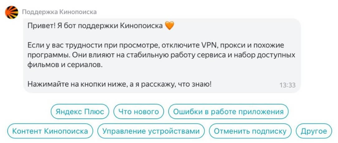 Поддержка в «Кинопоиске». И справка, и приветственное сообщение, и возможность сразу выбрать категорию вопроса