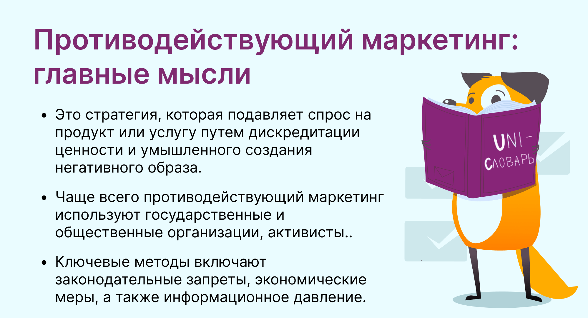 Противодействующий маркетинг — это стратегия, которая подавляет спрос на продукт или услугу путем дискредитации ценности и умышленного создания негативного образа. Эту ограничительную меру использует не сама компания, а внешние регуляторы: государство, общественные организации, активисты или конкуренты.