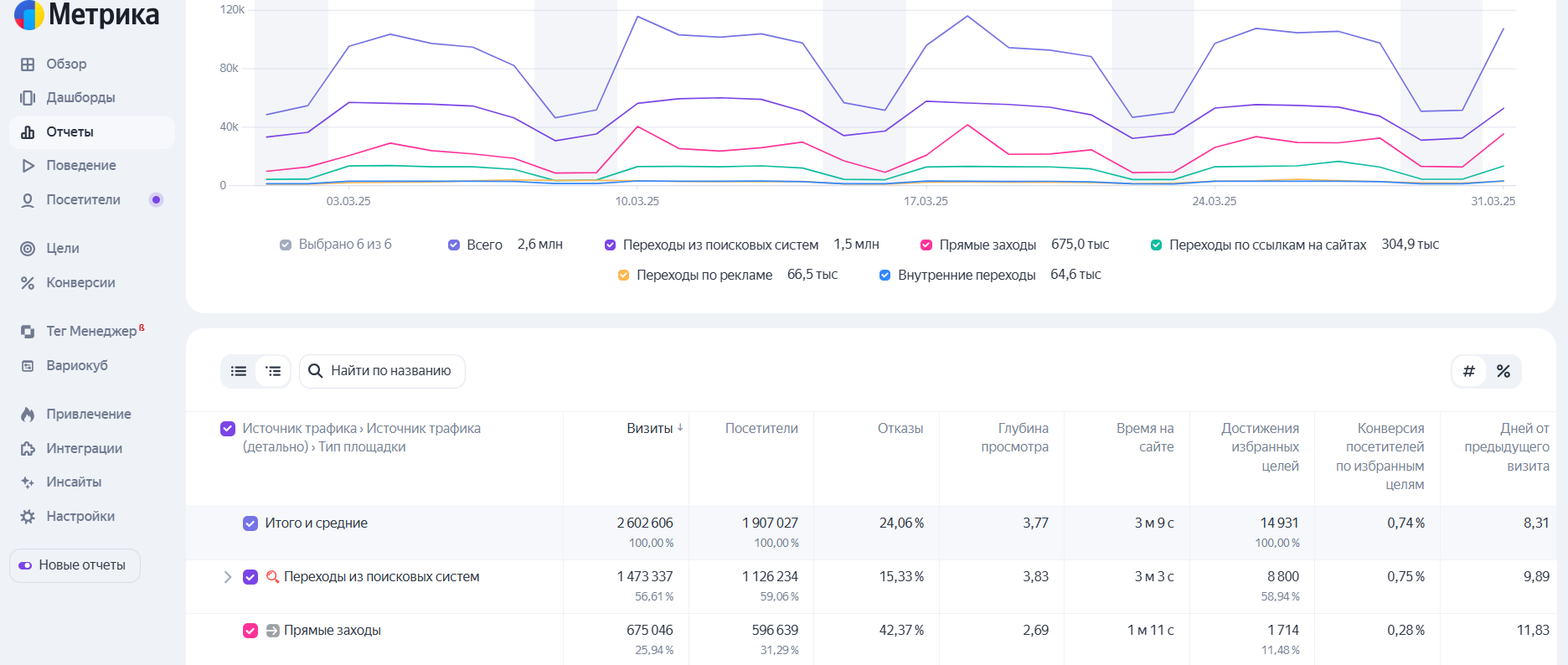 В отчете «Яндекс Метрики» по источникам можно увидеть не только количество визитов и посетителей в разрезе каждого источника, но также среднее количество отказов, глубину просмотра и даже конверсию в достижение цели (если цели настроены)