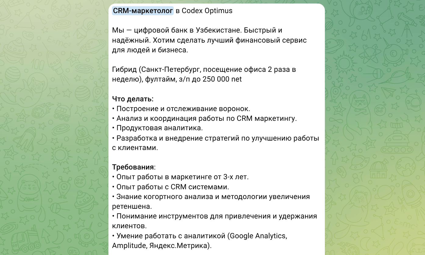 В Telegram-каналах тоже попадаются вакансии СRM-маркетологов.
