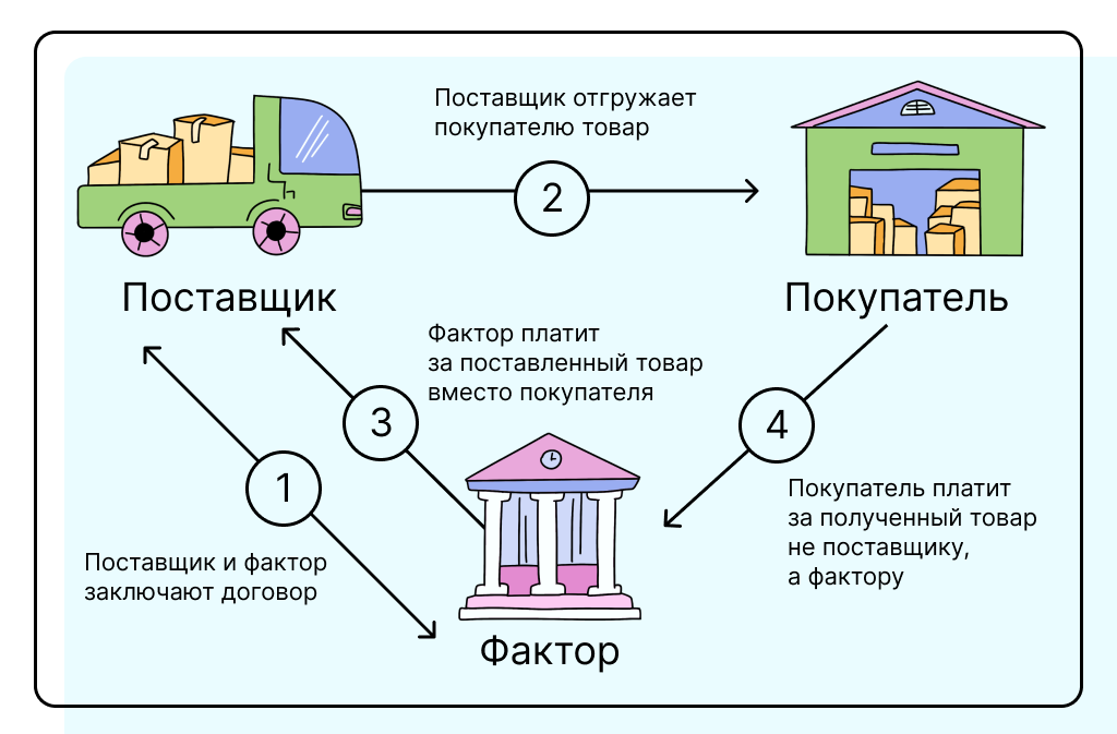 В факторинге участвуют три стороны: поставщик, покупатель и фактор. Фактор — это специализированная компания или банк. Он выступает финансовым посредником: сразу перечисляет поставщику деньги за отгруженный товар, а позднее получает оплату уже от покупателя в срок, указанный в договоре. Фактор берет у поставщика комиссию за услугу.