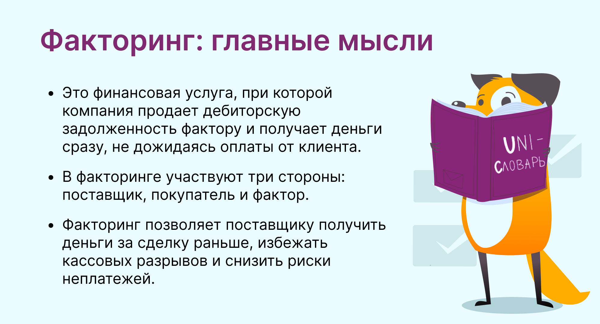 Факторинг — финансовая услуга, при которой компания продает дебиторскую задолженность, то есть неоплаченные счета, фактору и получает деньги сразу, не дожидаясь оплаты от клиента.