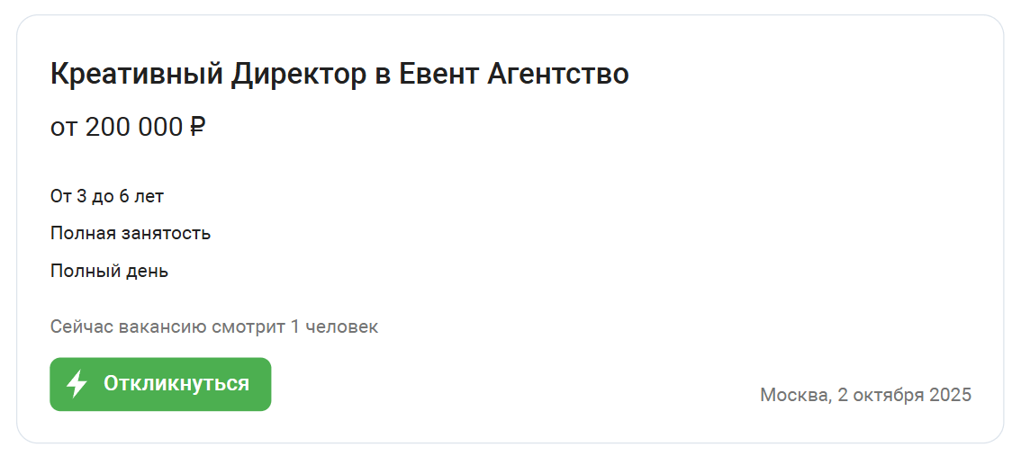 В вакансии подчеркивается, что опыт работы в креативных ивент-агентствах от 3-х лет для соискателя обязателен