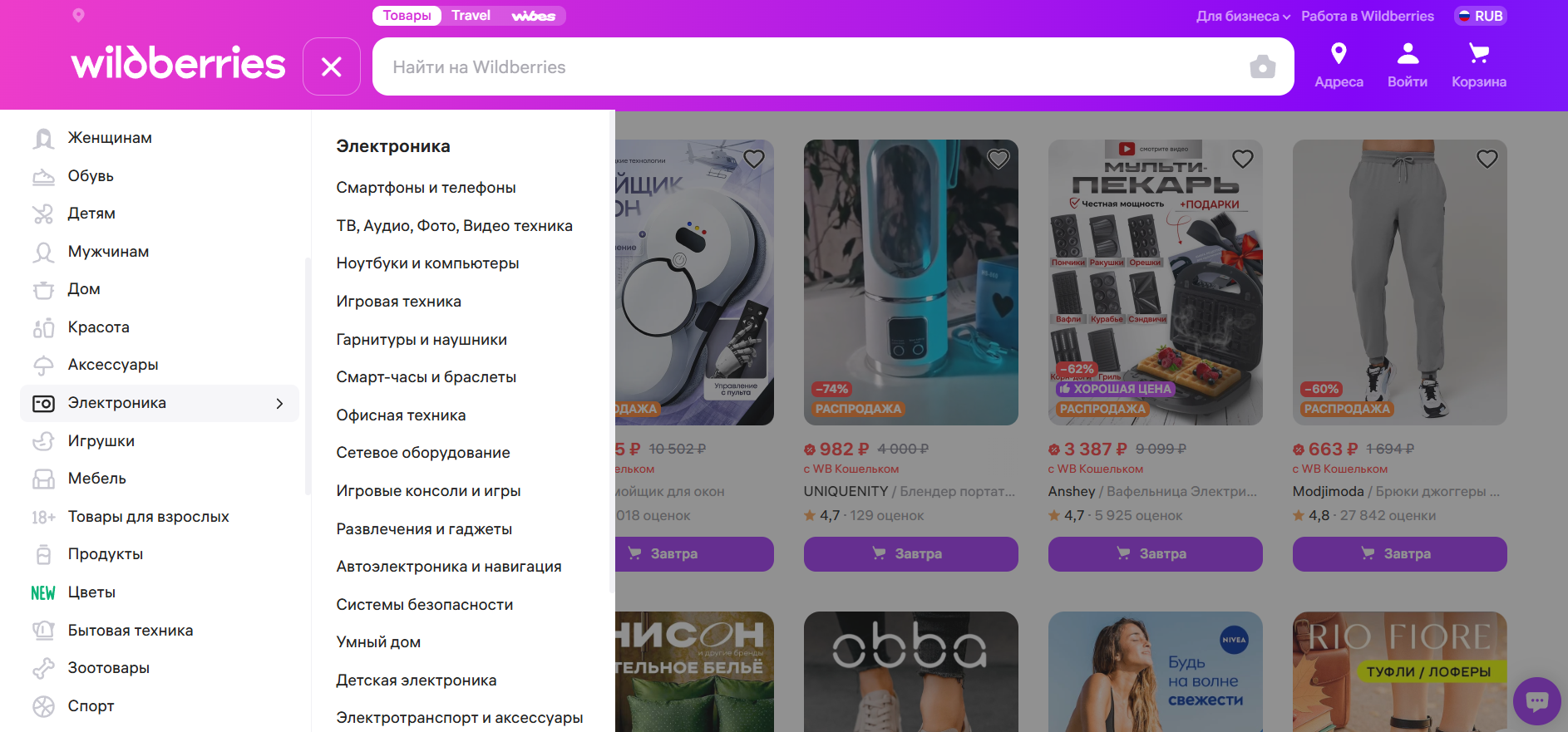 Раздел категорий товаров на Wildberries