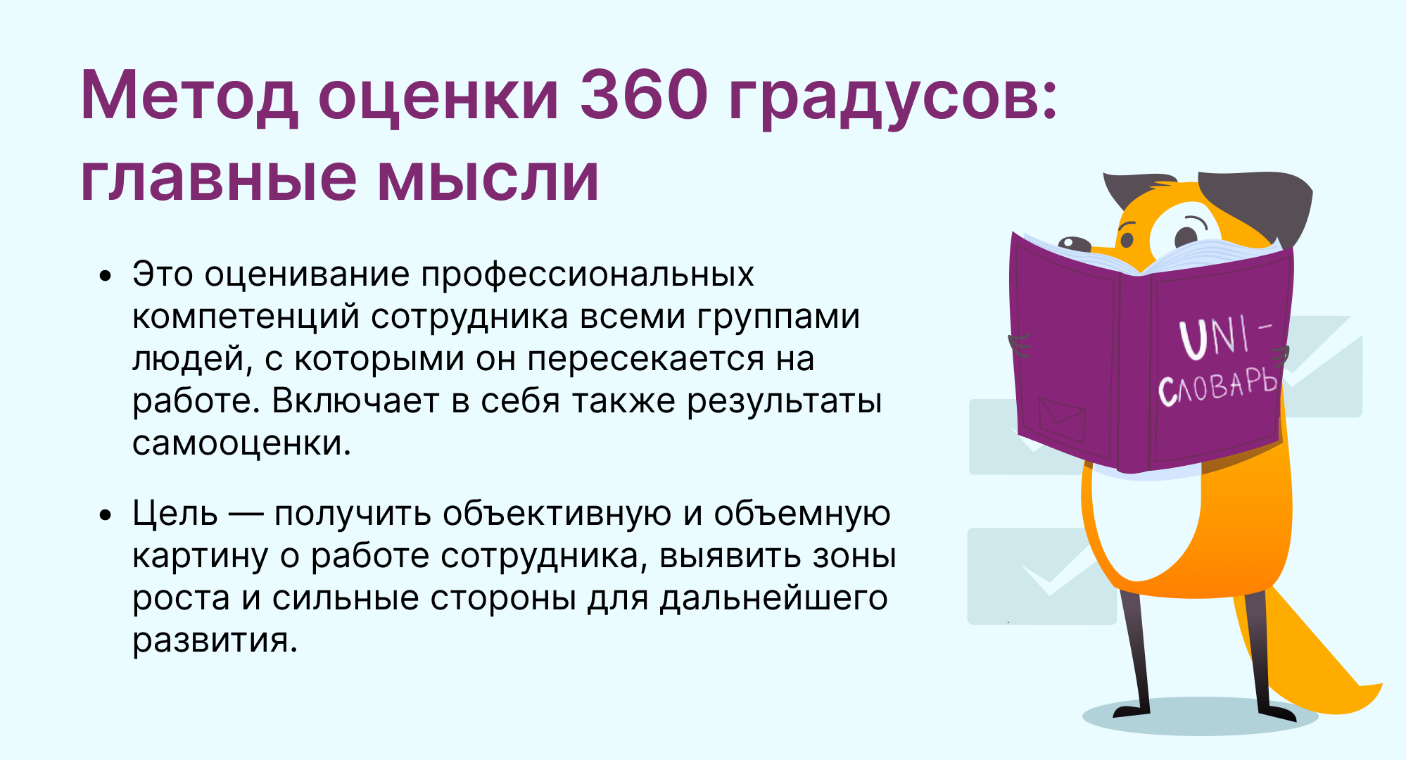 Метод оценки 360 градусов — это оценивание профессиональных компетенций сотрудника всеми группами людей, с которыми он пересекается на работе. Включает в себя также результаты самооценки.
