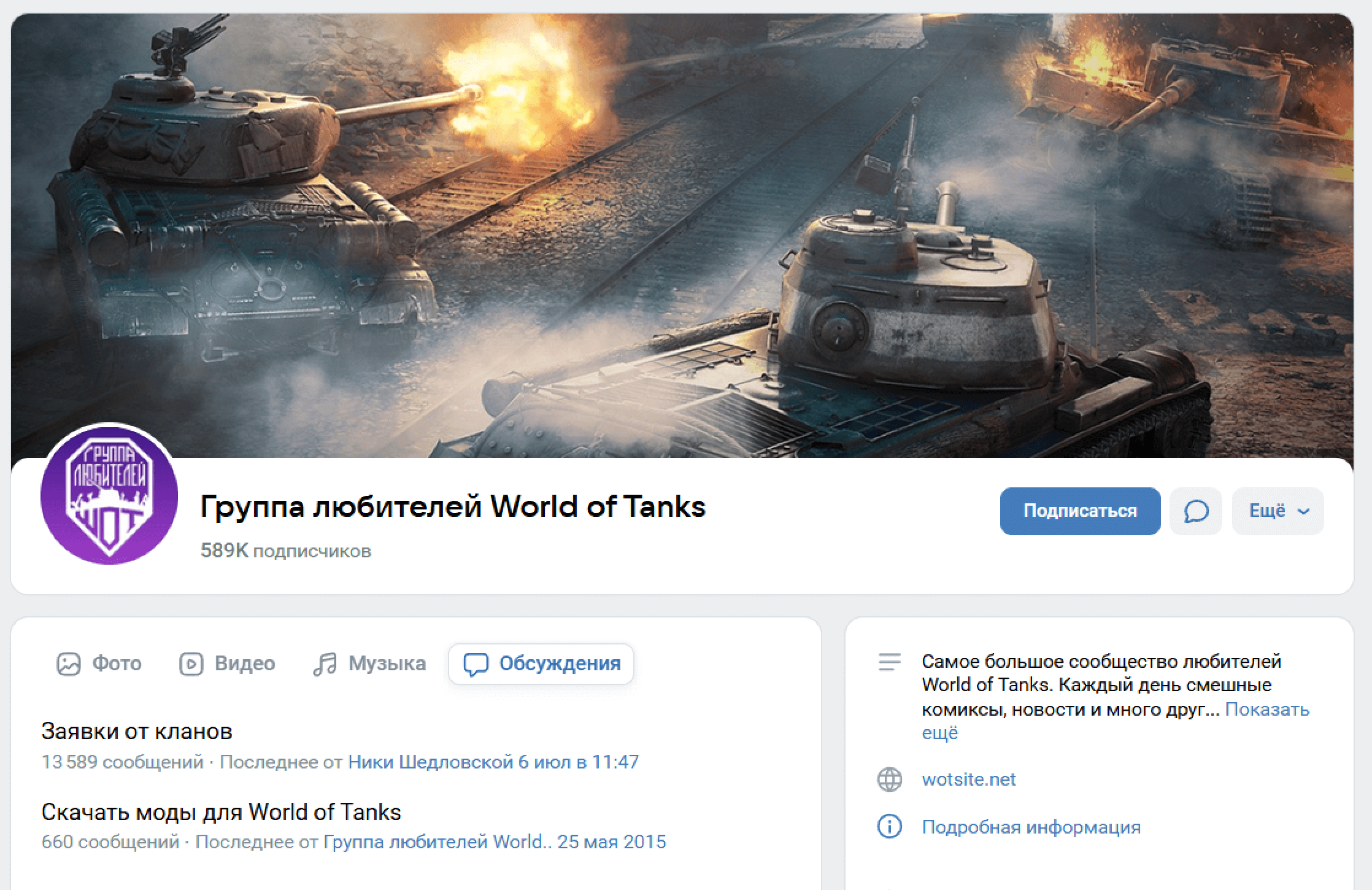 Группа любителей World of Tanks во «ВКонтакте» объединяет более 600 тысяч киберспортсменов и поклонников игры. Здесь они могут найти партнеров для команды и обсудить интересующие темы