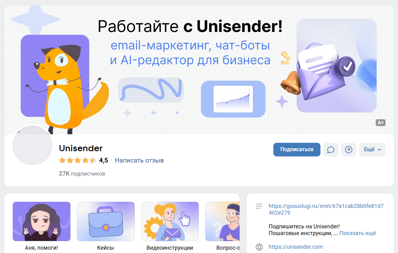 У Unisender есть свой паблик в соцсети «ВКонтакте». На странице публикуют новости компании, полезные статьи, инструкции и советы по продвижению в интернете