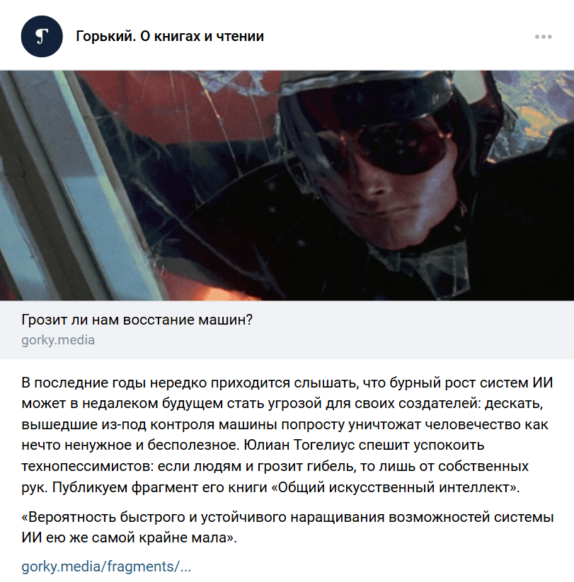 Издание «Горький» выкладывает в свой паблик анонсы материалов с ссылками на сайт