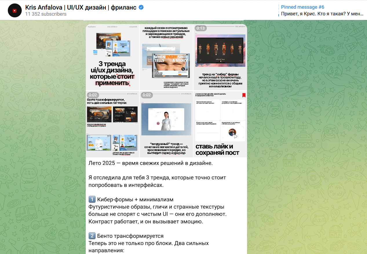 В своем Telegram-канале дизайнер Крис Анфалова делится полезными материалами в формате карточек, а также обучающих видео и туториалов