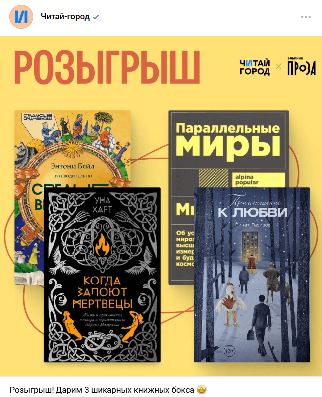Крупная российская сеть книжных магазинов «Читай-город» разыгрывает 3 книжных бокса. Для участия нужно подписаться на паблик компании во «ВКонтакте» и написать в комментариях, какую книгу вы открыли для себя этим летом и порекомендовали бы другим