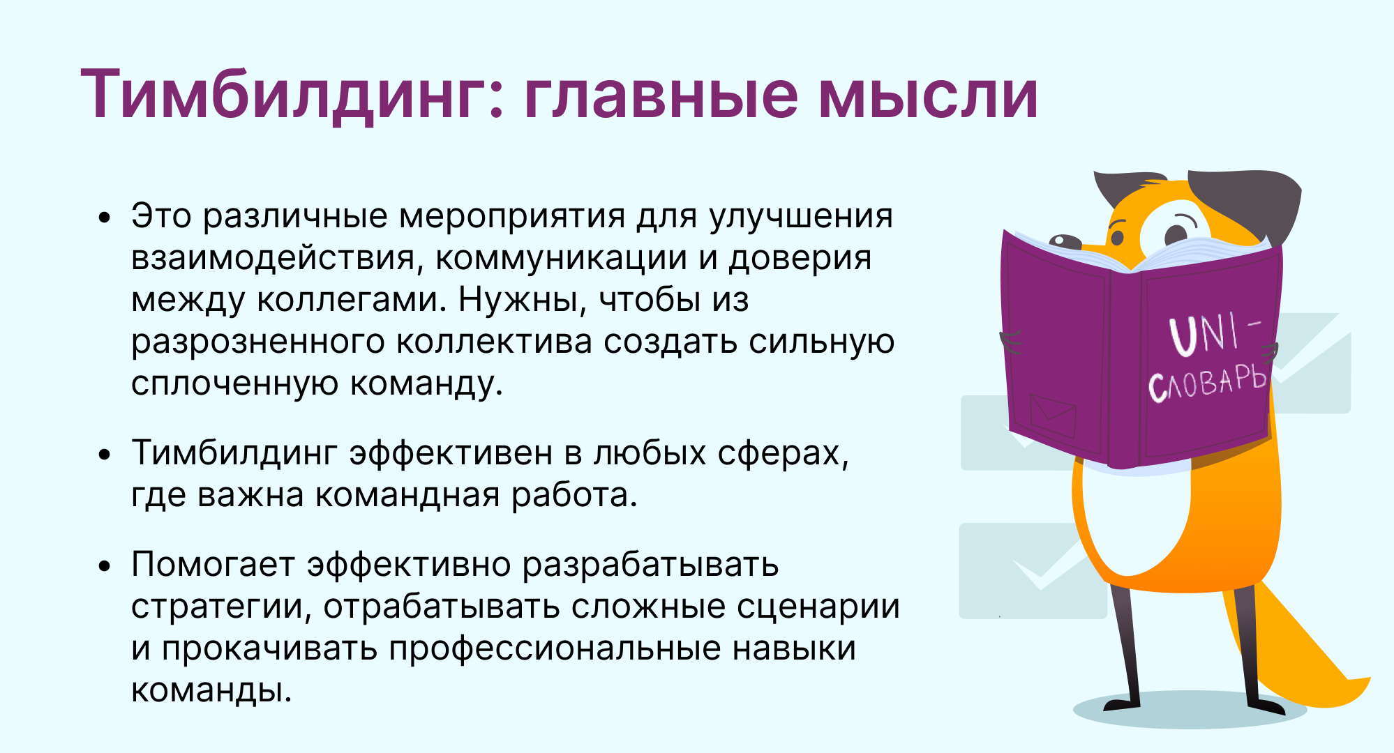 Тимбилдинг — это различные мероприятия для улучшения взаимодействия, коммуникации и доверия между коллегами. Нужны, чтобы из разрозненного коллектива создать сильную сплоченную команду.
