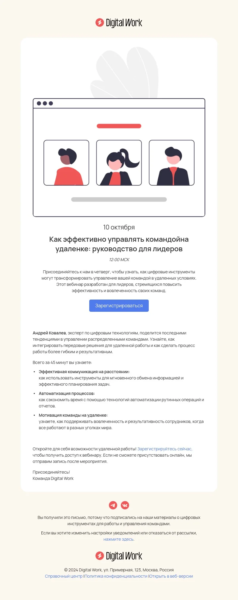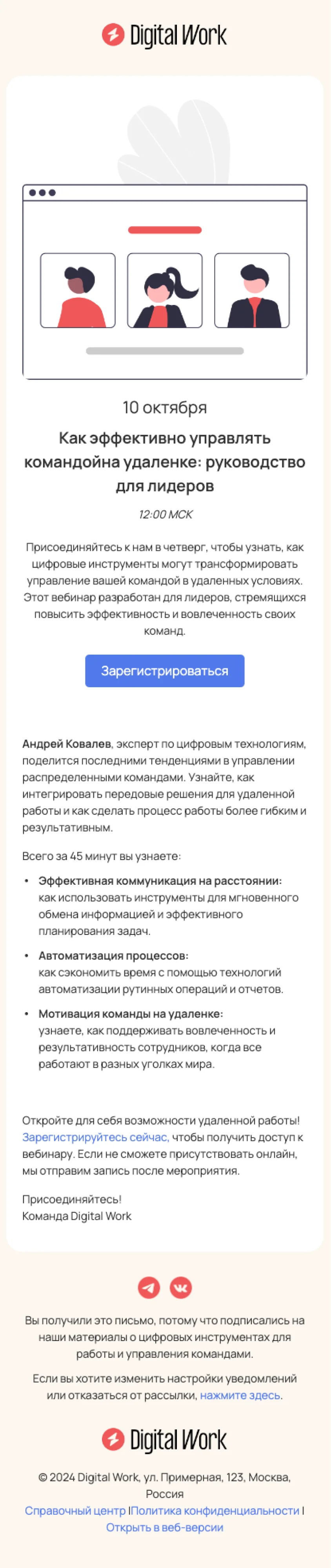 Шаблон письма «Как эффективно управлять командой на удалёнке» создан для email-рассылки с приглашением на вебинар. Также его можно использовать при запуске длительных курсов, анонсах форумов, конференций, митапов и других образовательных и профессиональных мероприятий. Добавьте в шаблон описание события, дату, стоимость — и пригласите подписчиков зарегистрироваться.