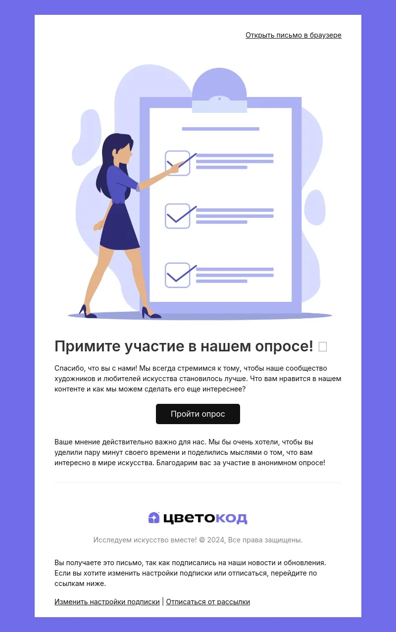 При помощи email-шаблона «Как улучшить мир искусства» вы сможете провести опрос и собрать обратную связь — такая рассылка может быть актуальна не только в сфере культуры. Шаблон пригодится всем: НКО, образовательным учреждениям, медицине, бизнесу и компании в любой сфере. Письмо поможет собрать реальные отзывы об услугах и товарах, повысить клиентоориентированность и улучшить качество продукта и сервиса.