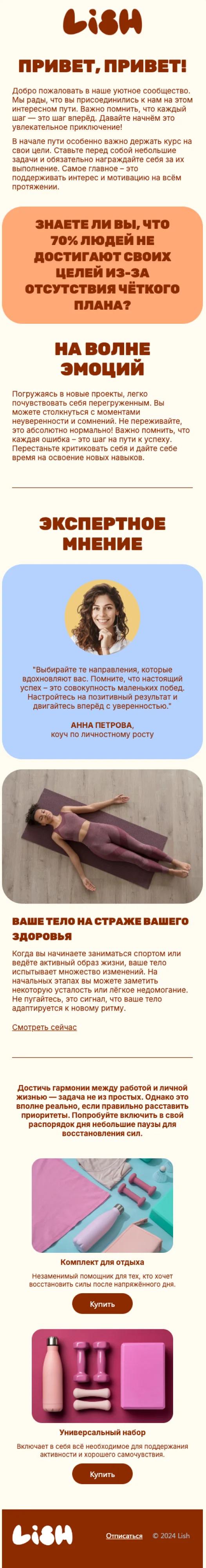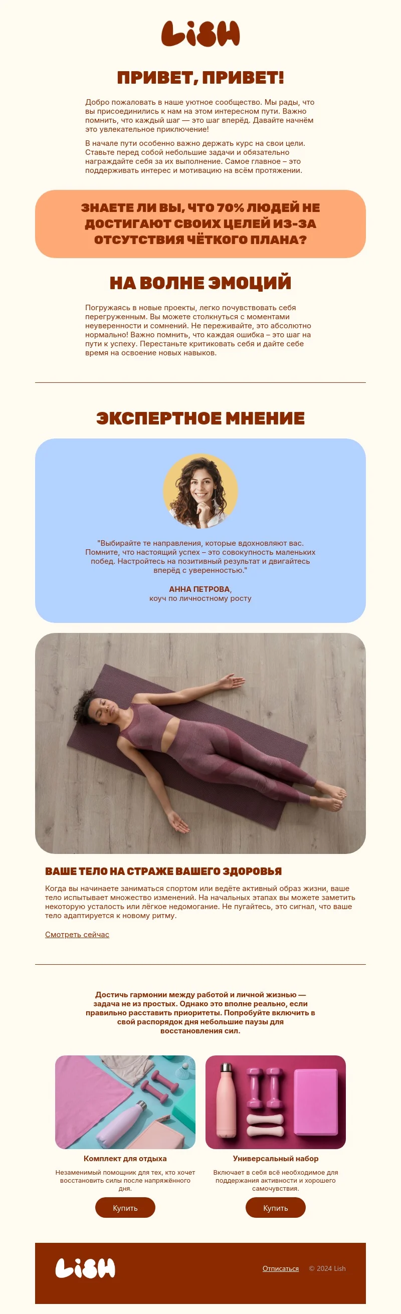 При помощи email-шаблона «Маленькие шаги к большим достижениям» вы сможете легко создать информационную рассылку с элементами промо. Шаблон подойдёт фитнес-тренерам, спортивным клубам, студиям йоги или пилатеса, танцевальным студиям. Дайте несколько советов по поддержанию отличной формы и предложите полезные программы и занятия, которые могут заинтересовать ваших подписчиков.