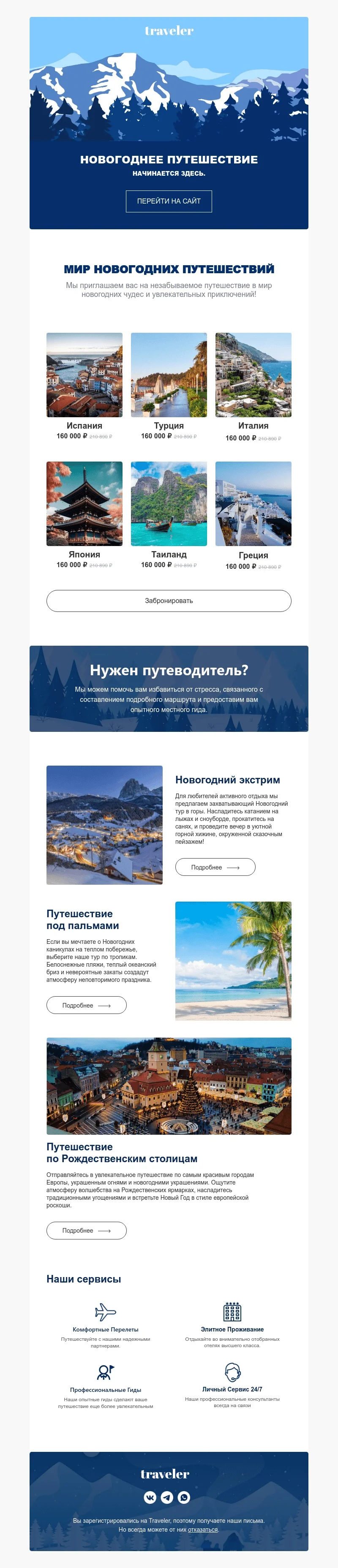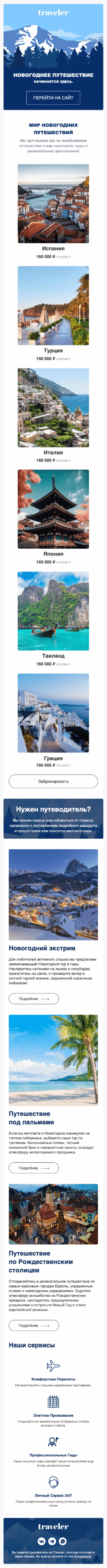 Email-шаблон «Новогоднее путешествие» поможет маркетологу в авральном декабре. Используйте этот праздничный макет, чтобы поздравить клиентов с наступающим Новым годом и предложить варианты того, как провести зимние каникулы. Шаблон предназначен для туроператоров и агентств, билетных агрегаторов, авиакомпаний и других перевозчиков.