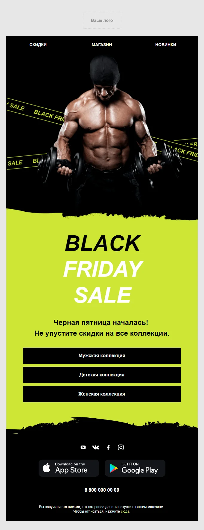 Email-шаблон «Чёрная пятница — скидки на все коллекции» подойдёт тем, кто предлагает товары для спорта: оборудование и тренажёры, спортивную одежду и обувь, аксессуары и спортивное питание. Дизайн освежающий: традиционный для акции чёрный цвет скомбинирован с кислотно-зелёным — такое письмо точно бросится в глаза и запомнится подписчикам.