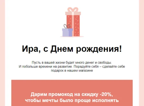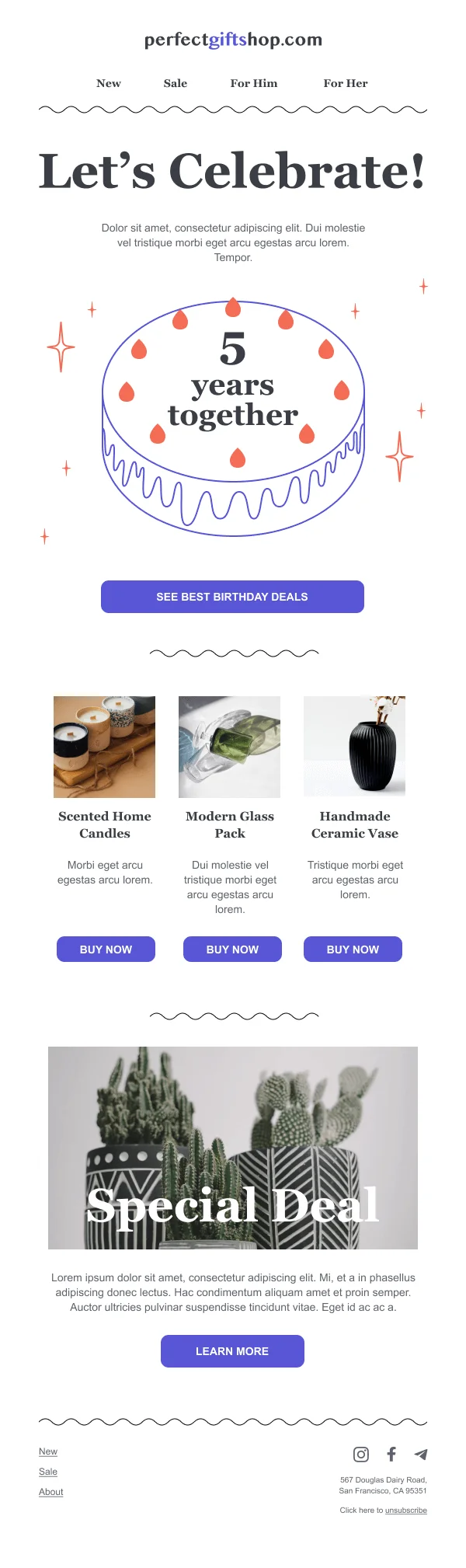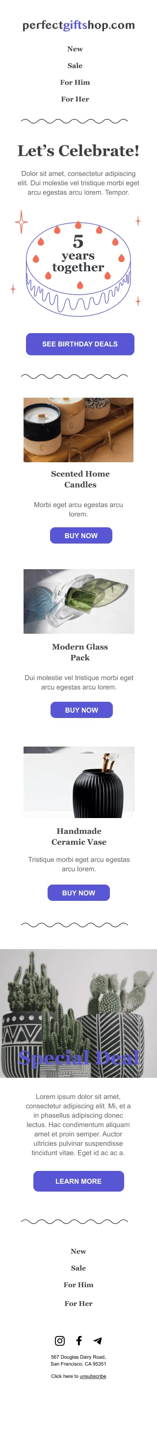 Email-шаблон «Давайте праздновать» подойдёт для рассылок в любой сфере и к любым праздникам. Таким письмом вы можете поздравлять подписчиков с личными и общими праздниками, а также напоминать им о том, как долго они являются вашими клиентами. Используйте макет в готовом виде или задавайте свой стиль — корректируйте цвета и шрифты, убирайте лишние блоки или добавляйте недостающие.