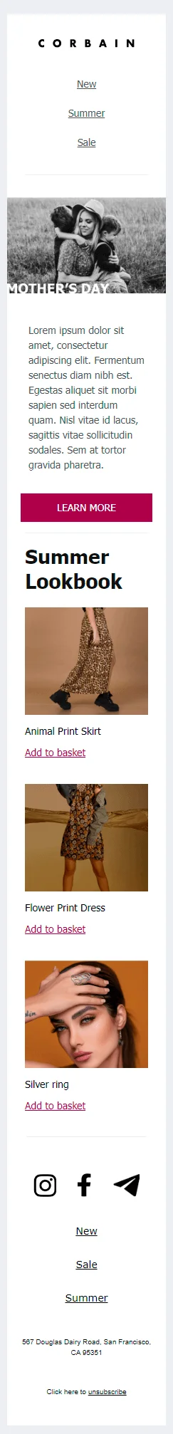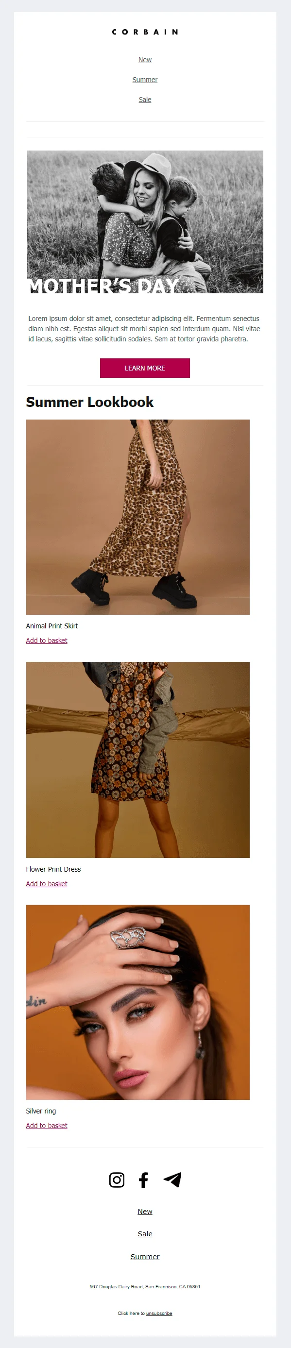 Email-шаблон «День матери» — для поздравления с важным праздником. В нём есть место и тёплым пожеланиям, и полезному контенту — например, с информацией об истории Дня матери, и подборке товаров, которые могут стать подарком к празднику. Дополнительно можно предложить скидку или подарок подписчицам при оформлении заказа с переходом из email-рассылки.