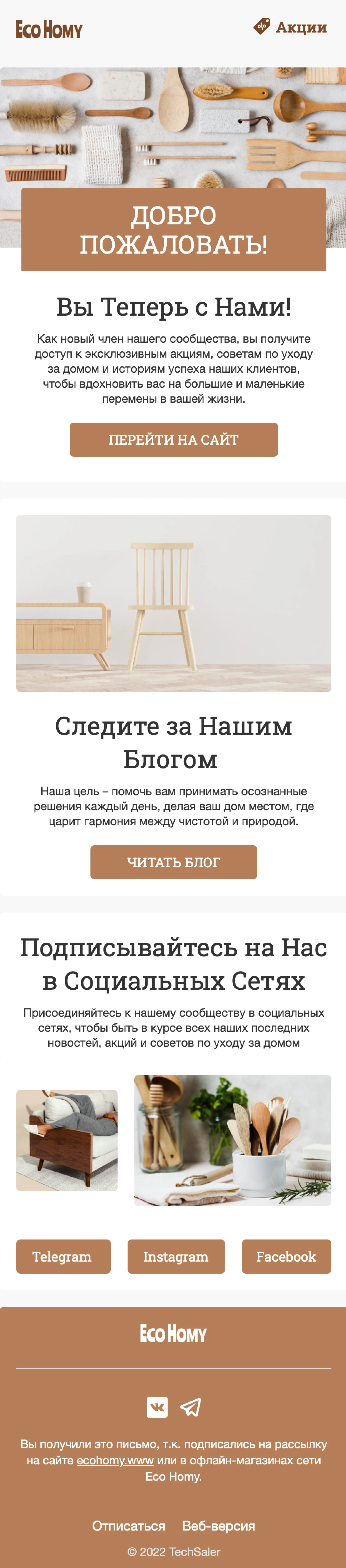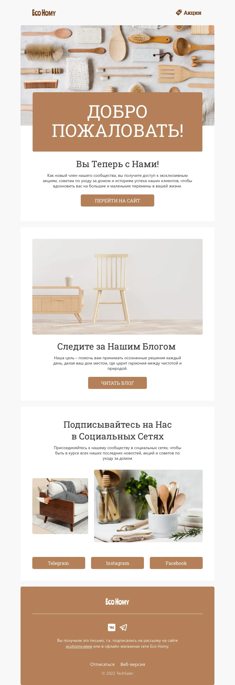 При помощи email-шаблона «Добро пожаловать, теперь вы с нами» вы сможете создать красивую рассылку для новых друзей брендов — тех, кто только что зарегистрировался на сайте или в приложении. Письмо поможет познакомить нового подписчика с компанией, пригласить его в комьюнити бренда, презентовать дополнительные каналы, которые будут полезны клиенту: блог и соцсети. Меняйте цветовую гамму под ваши корпоративные цвета, чтобы рассылка запомнилась новым пользователям.