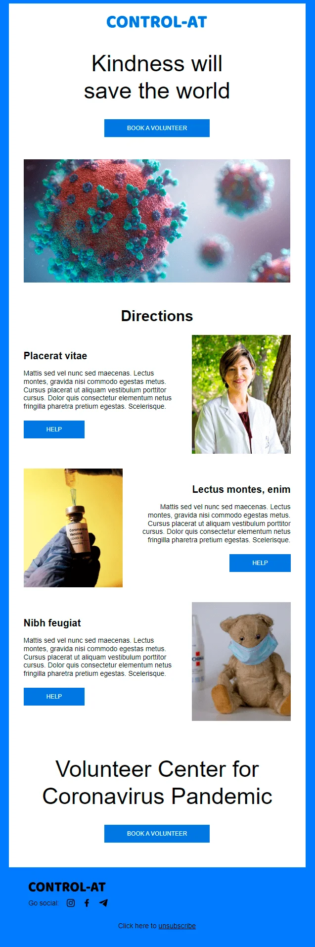 Email-шаблон «Доброта спасёт мир» предназначен для медицинских, благотворительных и некоммерческих организаций с социальной направленностью. С помощью этого макета можно отправить письмо со свежими новостями из жизни фонда и его подопечных, рассказать о нуждах и пожертвованиях, попросить помощи подписчиков на текущие проекты.