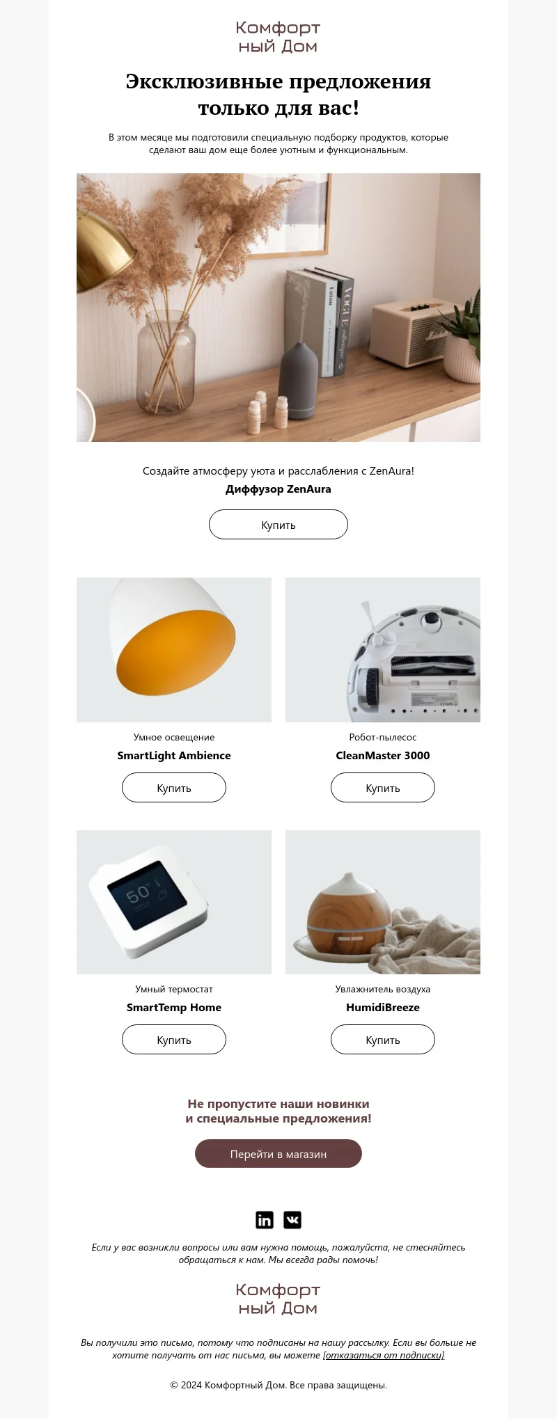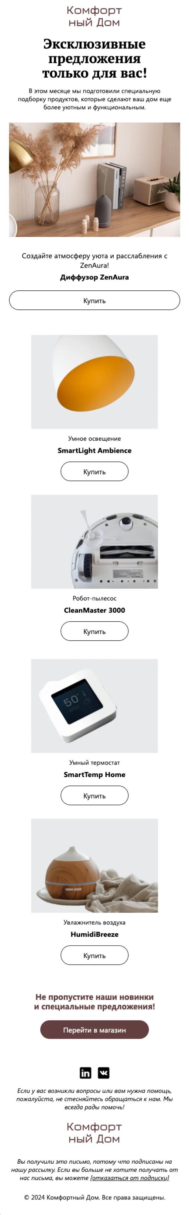 При помощи email-шаблона «Эксклюзивные предложения только для вас» вы сможете быстро создать лаконичную, но стильную рассылку клиентам интернет-магазина. В примере макета — тематика товаров для дома, но шаблон универсальный. Пригодится и тем, кто продаёт гаджеты, одежду, детские игрушки и т.д. Просто подставьте свои карточки товаров, поменяйте тексты — и скорее отправляйте рассылку.