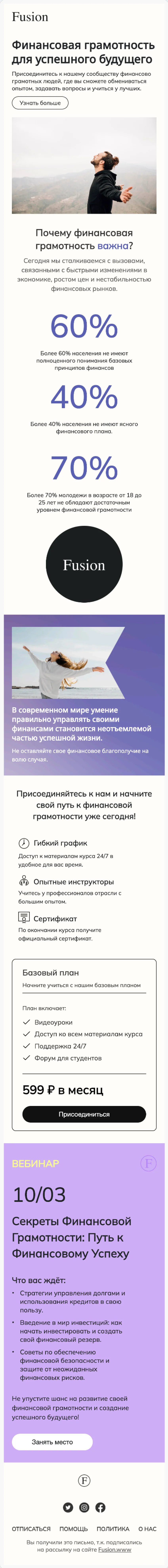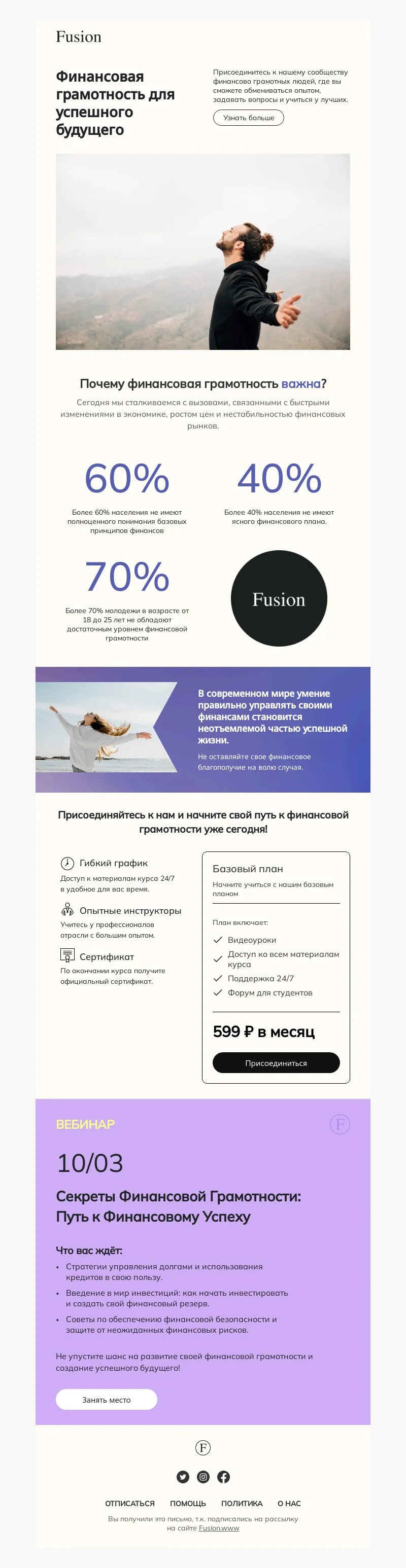 Email-шаблон «Финансовая грамотность для успешного будущего» создан для информационных и проморассылок в сфере EdTech, но подойдёт любым инфобизнесменам. С помощью этого макета легко собрать письмо, которое приглашает подписчиков стать частью тематического комьюнити, читать полезный контент, осваивать новые знания — в любой сфере.
