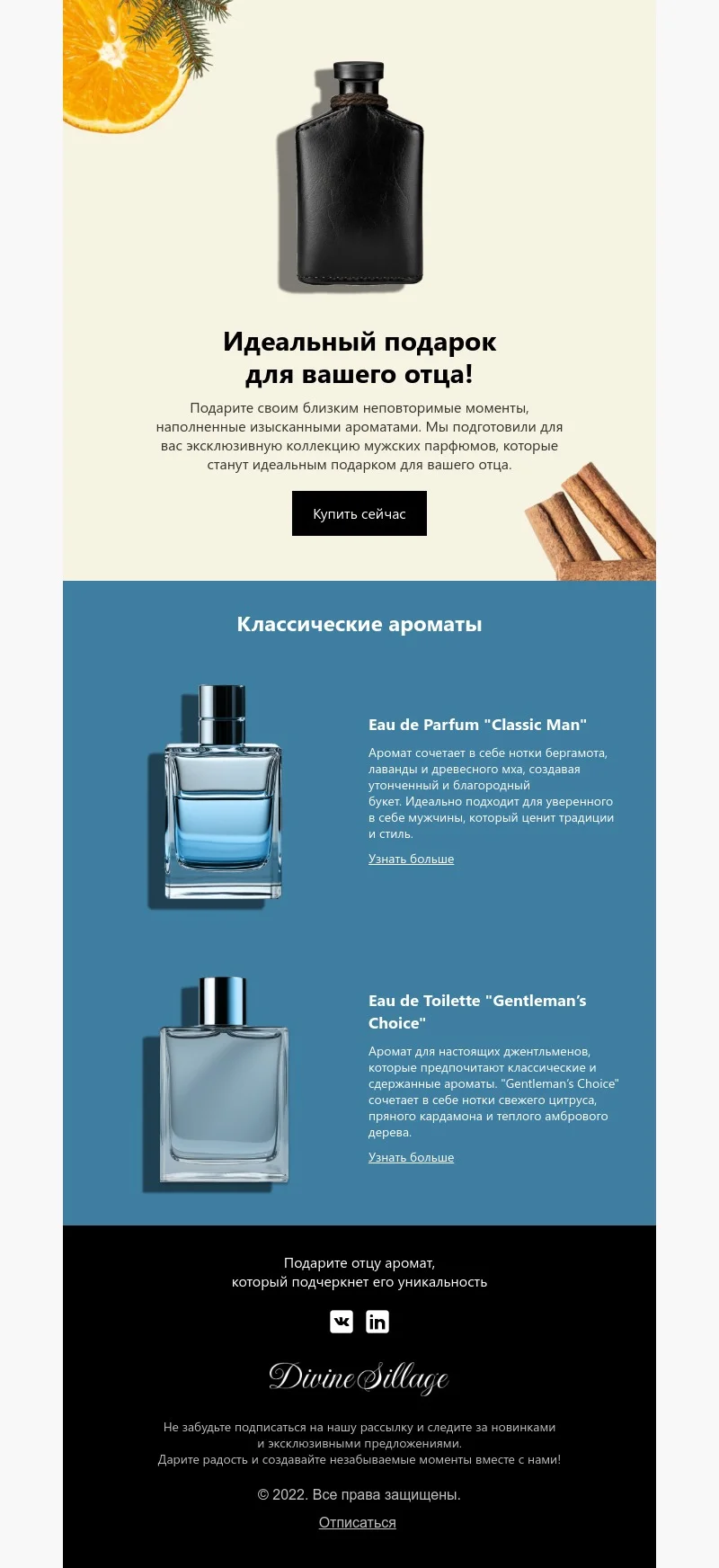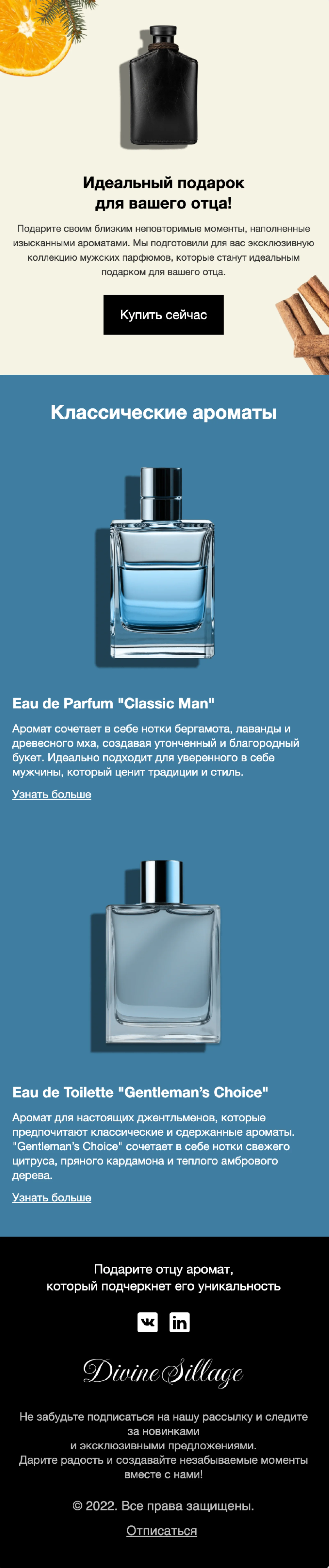 При помощи email-шаблона «Идеальный подарок для отца» вы сможете отправить рассылку ко Дню отца, 23 февраля или просто без повода — например, если в магазине проходит акция на товары для мужчин. В качестве примера в макете представлена мужская парфюмерия, но изображения и описания товаров можно заменить на любые другие позиции. Макет рассылки выполнен в сдержанных чёрно-синих цветах.