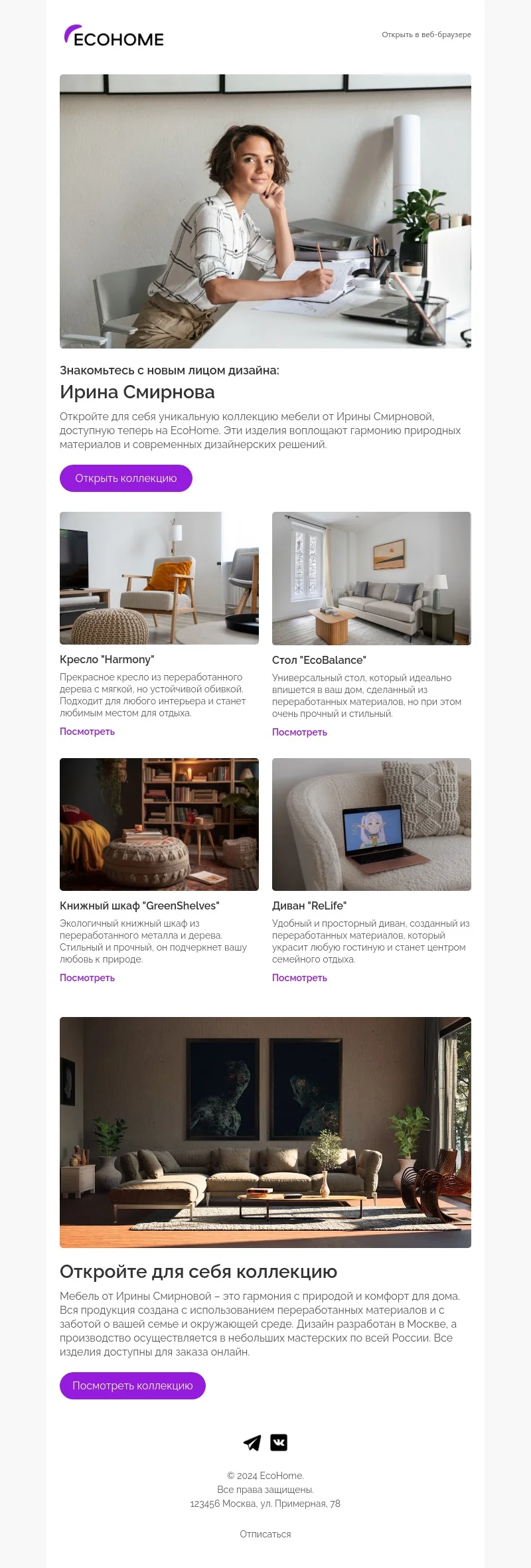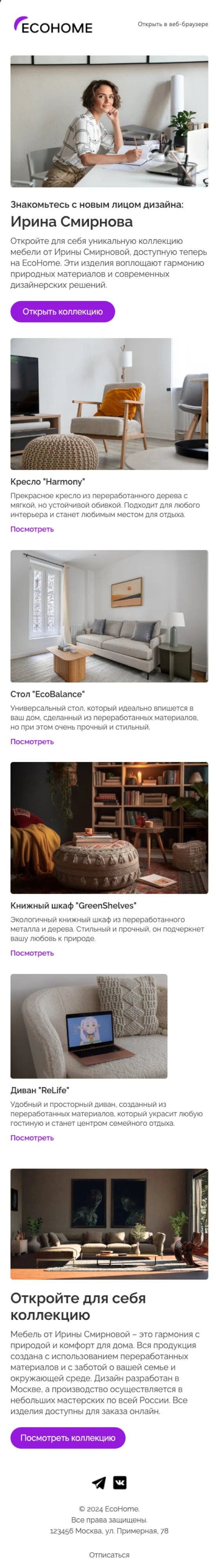 При помощи email-шаблона «Коллекция мебели» вы сможете создать стильную рассылку клиентам мебельного магазина, дизайнерского бюро или студии интерьеров и декора. Это не просто промописьмо — тут найдётся место интересным описаниям текстур, полезным советам по эргономике помещений и даже приветственному слову от ведущего дизайнера вашей студии.