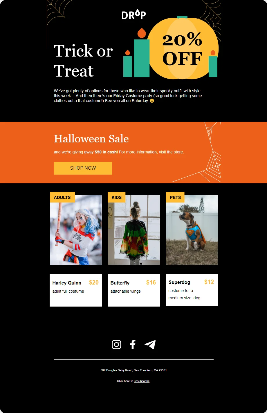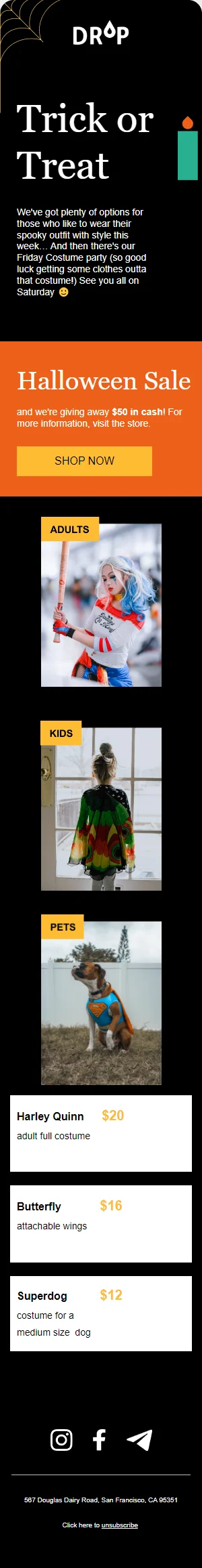 Email-шаблон «Кошелёк или жизнь!» — отличная идея для письма о распродаже в честь Хэллоуина. В макете использован классический для праздника стиль: чёрно-оранжевая гамма, загадочные паутинки в уголках письма. Разбавьте «устрашающий» дизайн и заголовок подборкой товаров из распродажи — и ни один подписчик не пройдёт мимо такой рассылки.