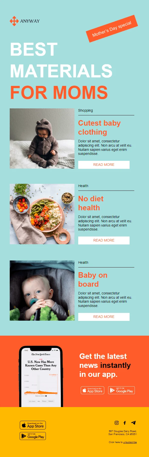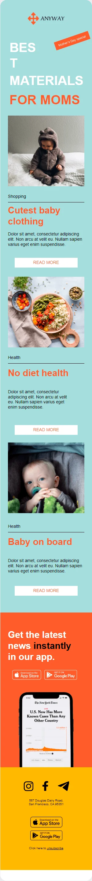 Email-шаблон «Лучшие статьи для мам» — отличный макет для информационной рассылки ко Дню матери. Такие письма могут отправлять медиа о родительстве, беременности и материнстве, детском образовании и т.д. Кроме того, если у интернет-магазина с детскими товарами есть тематический блог, такая email-рассылка станет важным звеном в комплексном контент-маркетинге.