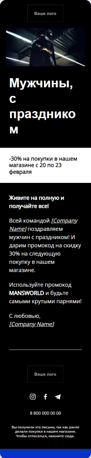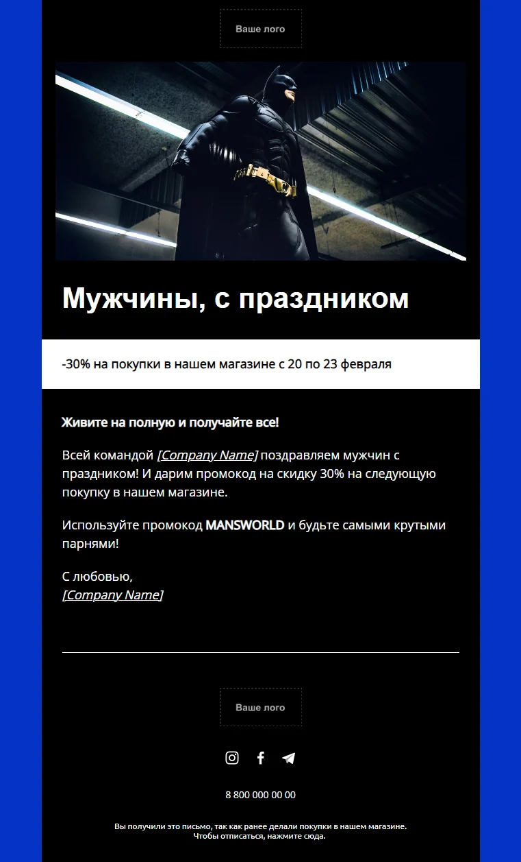 Email-шаблон «Мужчины, с праздником» предназначен для поздравительной рассылки к 23 февраля. В День защитника Отечества поздравьте подписчиков с праздником и предложите скидку на товары для мужчин. Не забудьте прописать условия специального предложения: как долго действует скидка, на какие категории и как её можно получить.