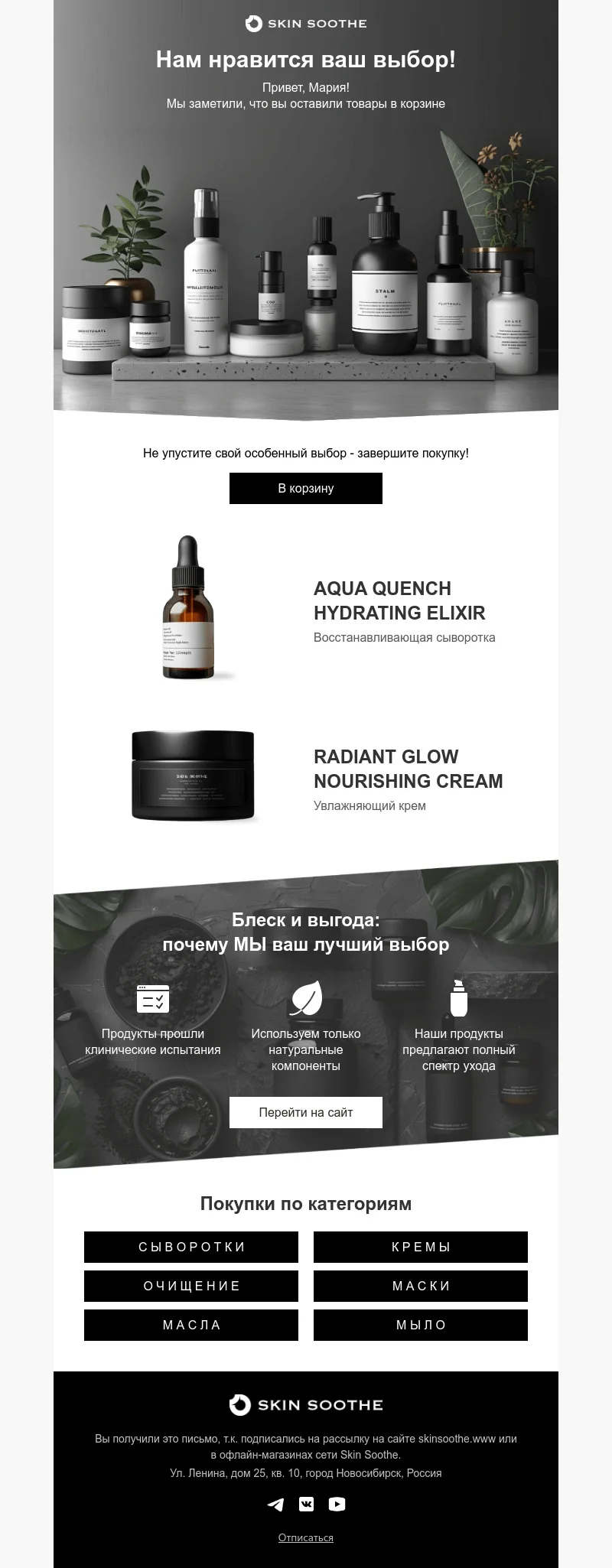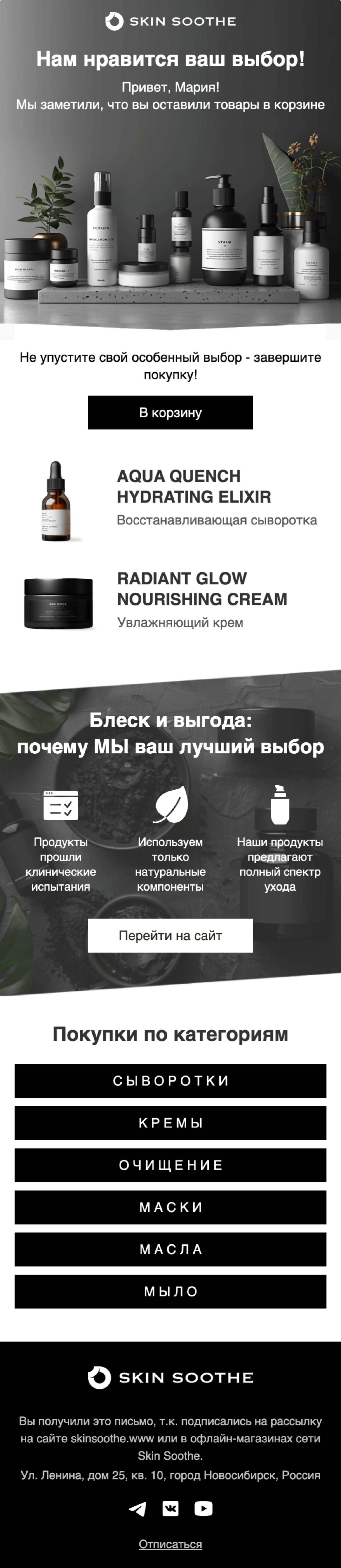 Используйте email-шаблон «Нам нравится ваш выбор», чтобы напомнить клиенту интернет-магазина о брошенной корзине. Этот макет пригодится при настройке и создании триггерной рассылки тем, кто положил товары в корзину, но так и не оплатил покупку. Напомните подписчику, что он планировал сделать заказ, дайте ссылки на выбранные товары и пригласите завершить оформление покупки в личном кабинете.