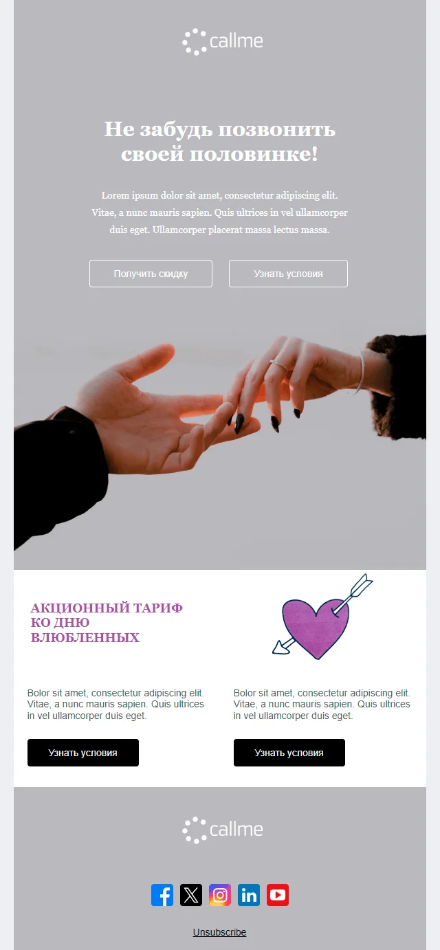 Email-шаблон «Не забудь позвонить своей половинке» предназначен для операторов сотовой связи. Хотите поздравить подписчиков с Днём святого Валентина и сделать действительно полезный подарок? Отправьте email-рассылку к 14 февраля с промокодом на скидку или специальным предложением тарифа для влюблённых.