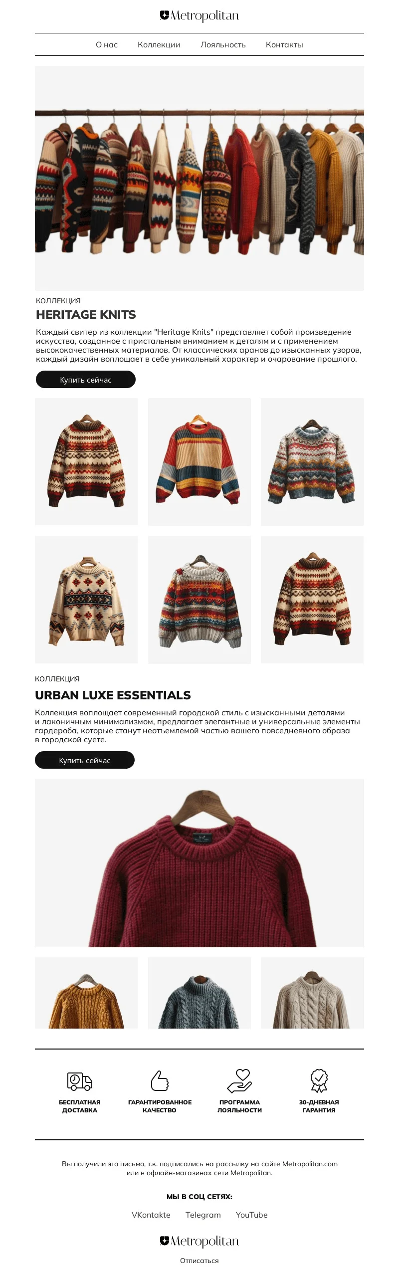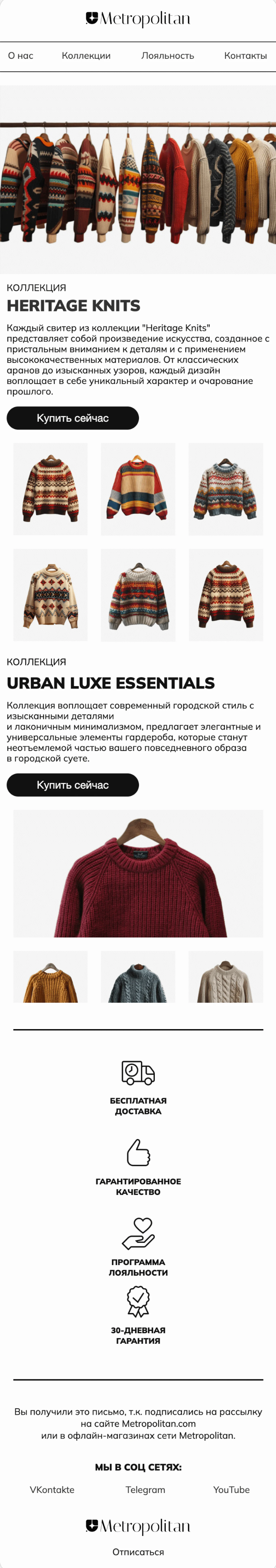 При помощи email-шаблона «Новая коллекция свитеров», который оформлен в уютном осеннем стиле, вы легко создадите стильную рассылку с презентацией новинок в ассортименте. Покажите лучшие товары, расскажите о них клиентам и предложите перейти на сайт, чтобы узнать больше и оформить заказ в интернет-магазине.