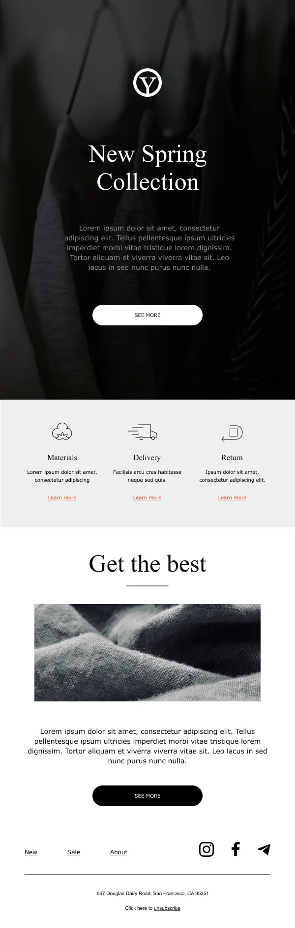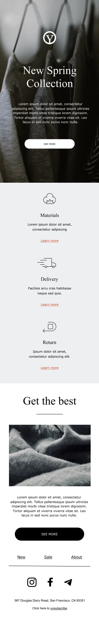 Покажите клиентам новинки вашего интернет-магазина — отправьте рассылку на основе шаблона «Новая коллекция». В email-макете есть блоки для фото и описания товаров, условий оплаты и доставки. Редактируйте шаблон, чтобы создать идеальное письмо для ваших покупателей: наполняйте своим контентом, меняйте фото, цветовую гамму и стиль кнопок, добавляйте недостающие блоки.