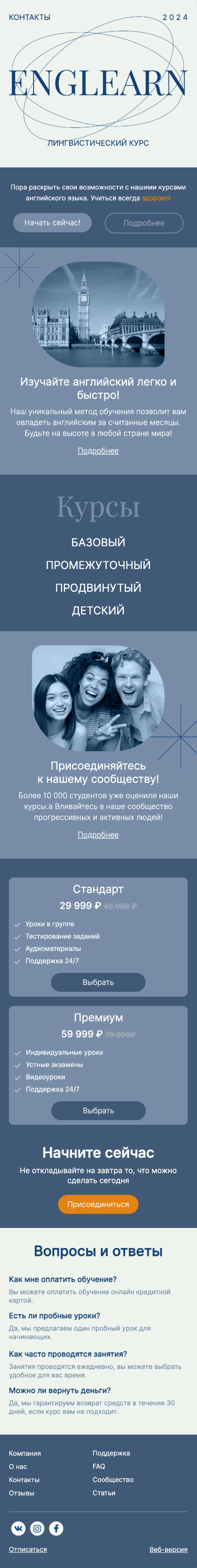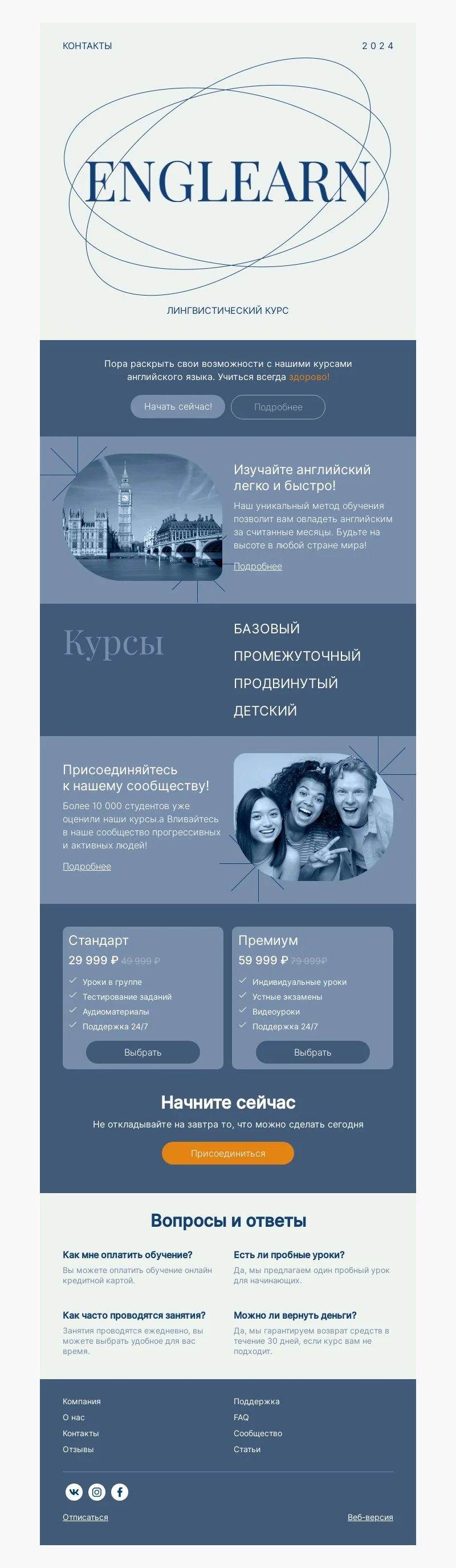 При помощи email-шаблона «Образовательный курс по изучению иностранного языка» вы создадите привлекательную рассылку для клиентов онлайн-школы. Используйте макет, чтобы рассказать об особенностях нового курса и пригласить подписчиков на обучение. В шаблоне предусмотрены для блоки для краткой информации, стоимости, ответов на часто задаваемые вопросы.