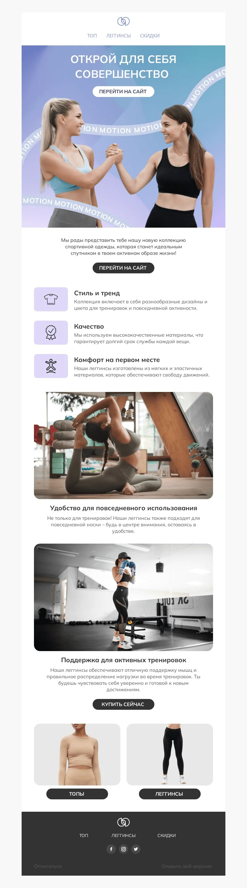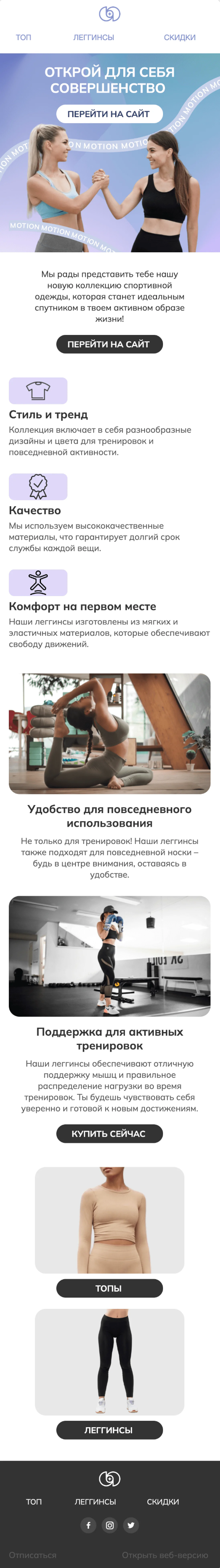 Шаблон email-рассылки «Одежда для спорта» — универсальный макет для проморассылки, которую может отправлять интернет-магазин, фитнес-клуб, спортивная студия. Рассказывайте про линейки товаров для спорта, анонсируйте акции и спецпредложения, презентуйте новинки ассортимента. В макете уже собраны подходящие фото, но вы можете подставить свои изображения, чтобы сделать рассылку уникальной.