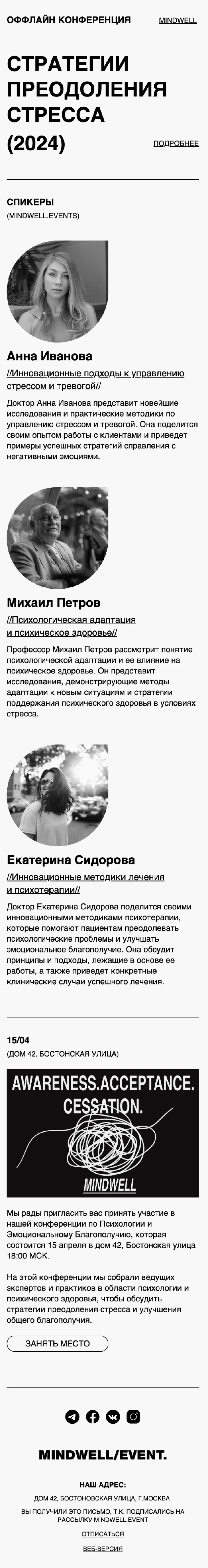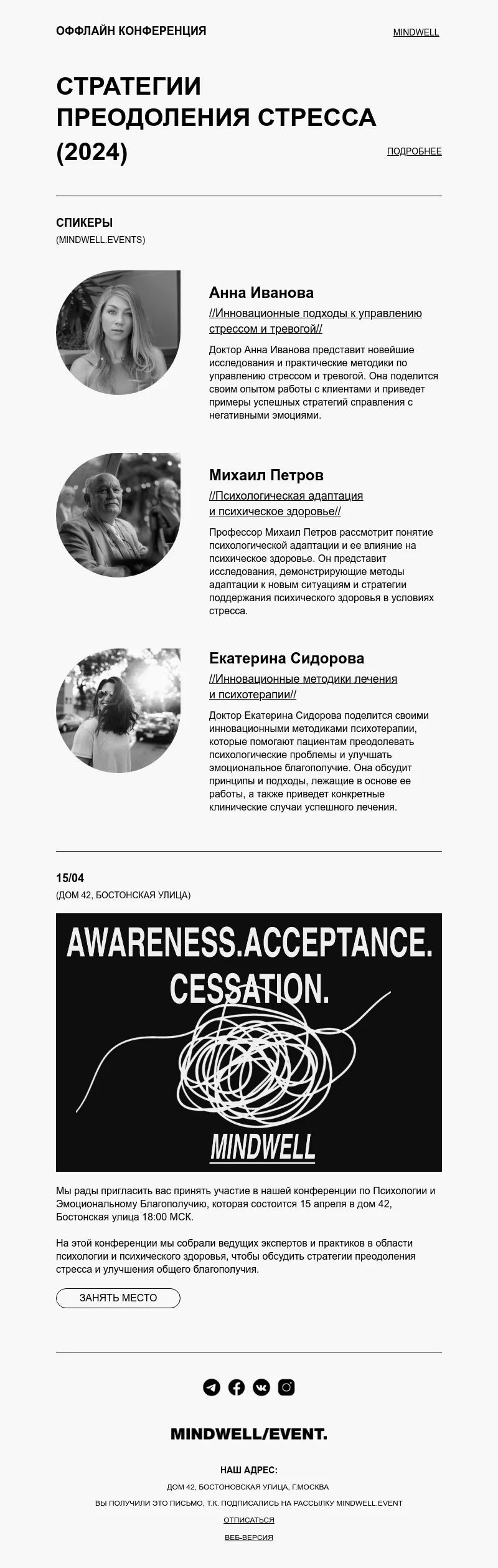 При помощи email-шаблона «Офлайн-конференция» вы сможете пригласить подписчиков на событие, которое проходит в офлайне (впрочем, и для онлайн-мероприятий шаблон тоже пригодится — просто внесите в него подходящий контент). Представьте спикеров, опишите предстоящее мероприятие и обязательно добавьте полезную информацию для участников: как добраться, какие условия будут организованы, как долго продлится встреча.