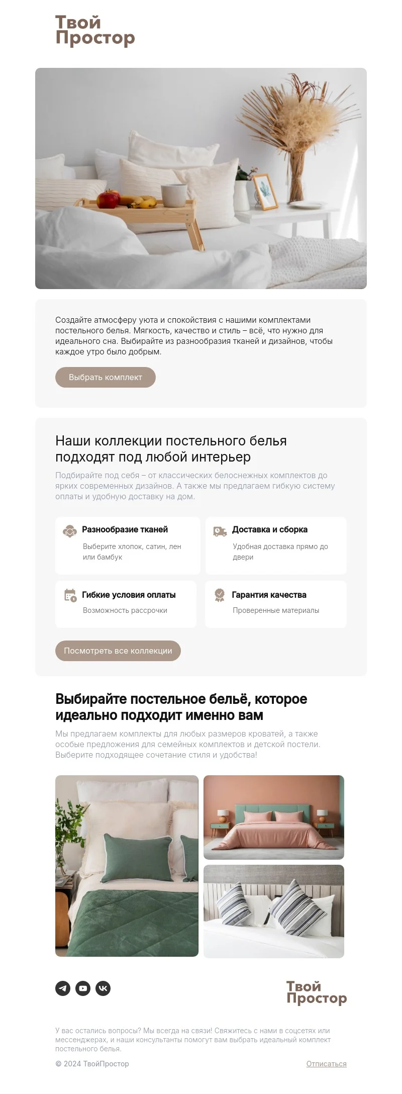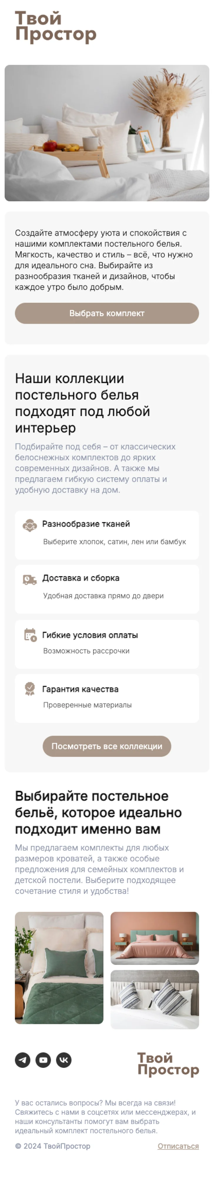 Email-шаблон «Погружайтесь в комфорт» подойдёт для рассылок по клиентам интернет-магазинов домашнего текстиля, декора и предметов уюта. Сама цветовая гамма этого макета — очень уютная, спокойная и нежная. Используйте шаблон, чтобы рассказать об ассортименте, познакомить с новинками и порадовать скидками подписчиков.