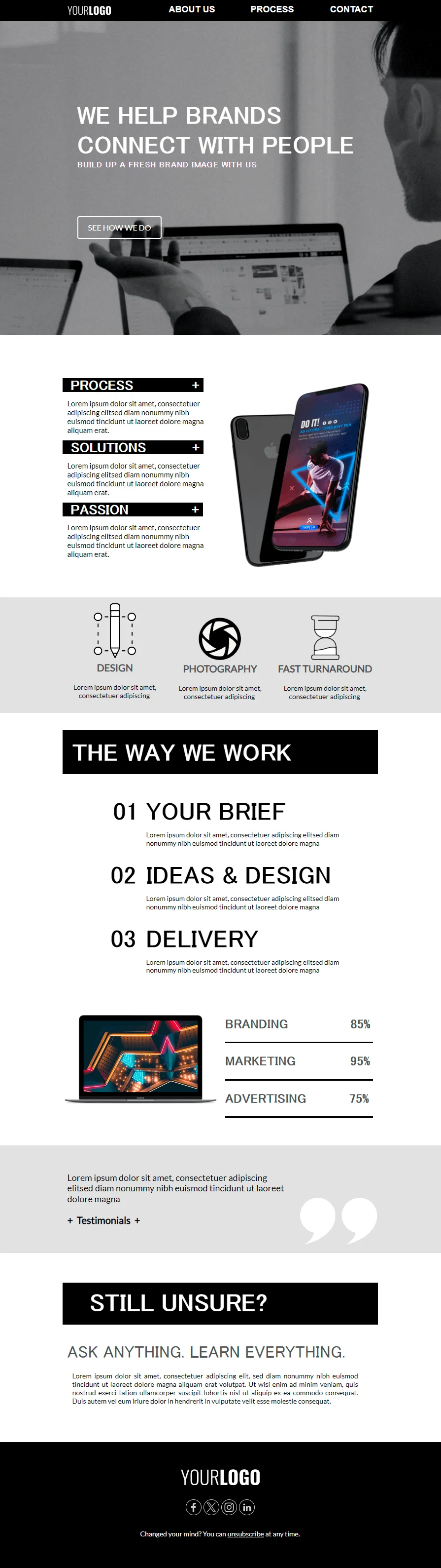 Email-шаблон «Помогаем брендам оставаться на связи с аудиторией» — для тех, кто понимает в брендинге и коммуникациях. Оказываете услуги в B2B-сегменте и улучшаете сервис компаний в разных нишах? Презентуйте свои услуги в email-рассылки. Расскажите об особенностях вашей деятельности, покажите удачные кейсы и предложите свои услуги новым клиентам.