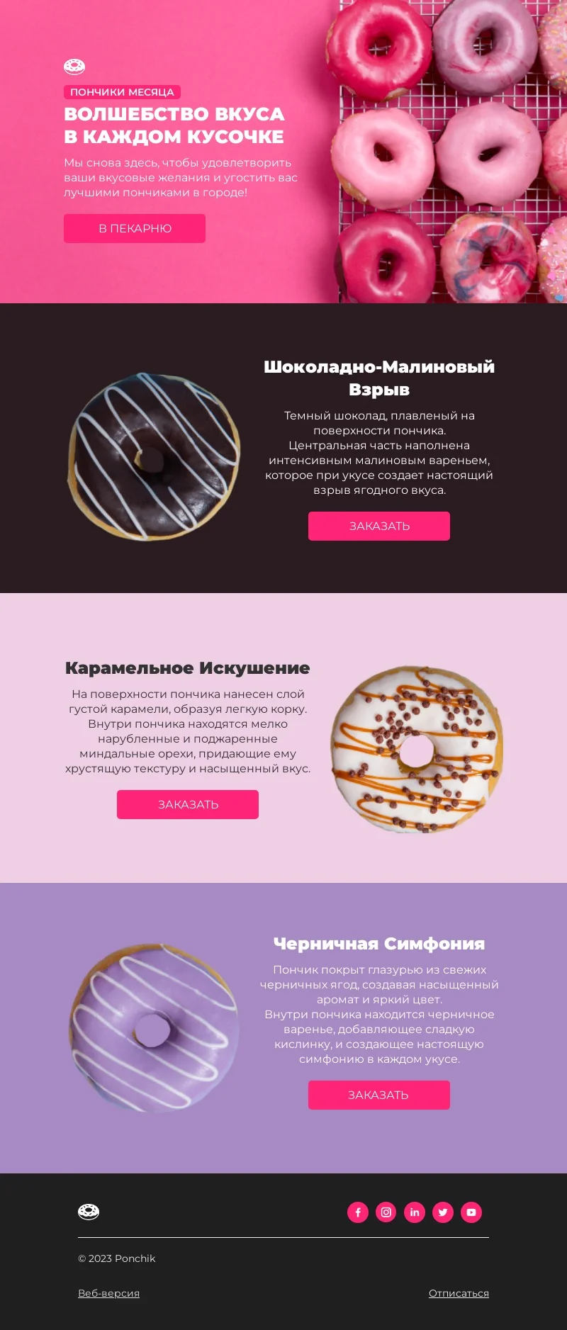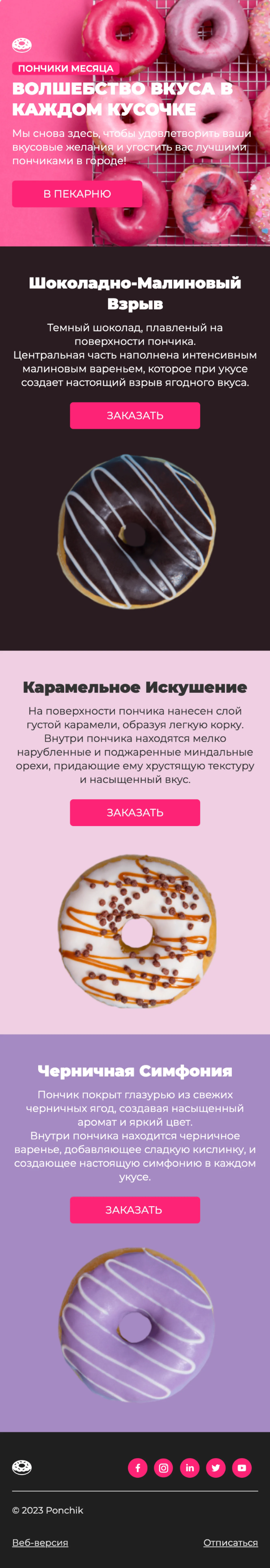 Email-шаблон «Пончик месяца» — красочный, яркий и аппетитный! Он пригодится пекарням, кондитерским, кофейням и всем, кто радует своих клиентов вкусными десертами. Используйте шаблон, чтобы отправлять регулярные проморассылки, сообщать покупателям об акциях и спецпредложениях, презентовать новинки в ассортименте. Не забудьте добавить больше информации о товарах и компании, а также при необходимости — настроить цветовую гамму.