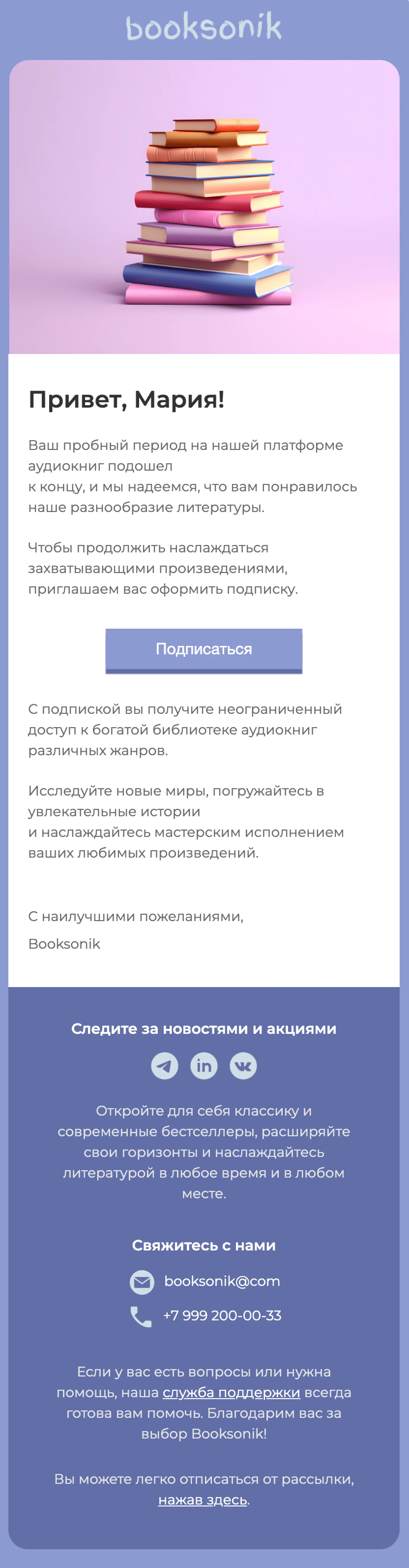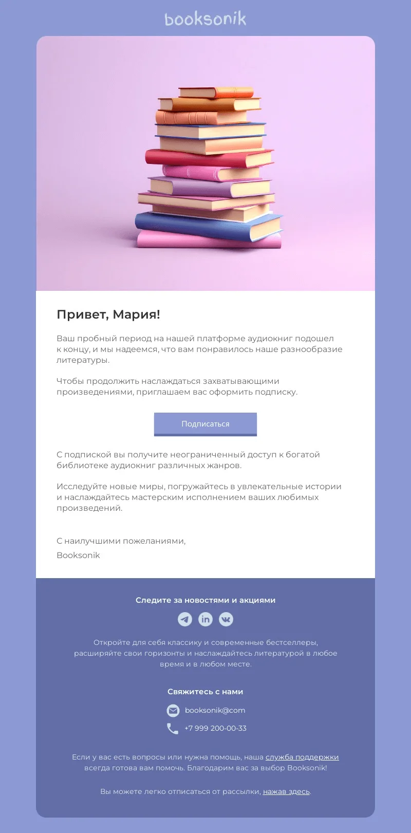 Email-шаблон «Приглашение оформить подписку» пригодится всем, кто ведёт свои рассылки — авторские и от имени бренда. Используйте макет и его структуру, что рассказать о том, какие письма вы пишете, описать пользу регулярной рассылки для читателя и пригласить пользователя стать подписчиком. Как и в любой рассылке, здесь актуальна подробная информация об отправителе, дополнительные контакты и интересный визуал, чтобы привлечь внимание адресата.